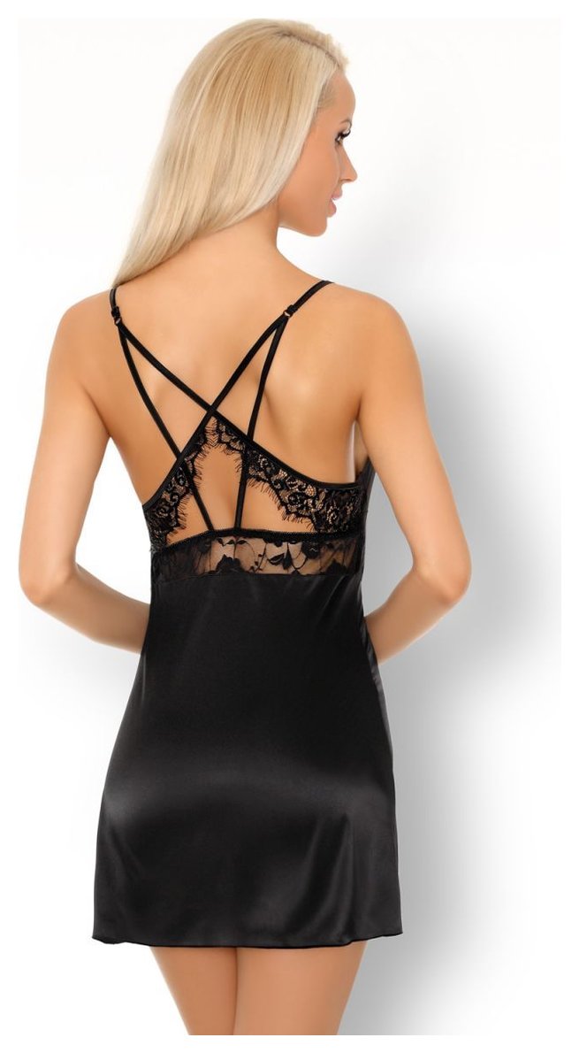 Элегантная сорочка на тонких бретелях с открытой спиной, сорочка украшена кружевом и вышивкой, выполнена из атласного материала. В комплекте: сорочка и трусики-стринги.