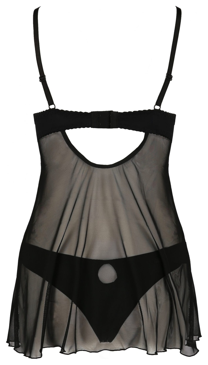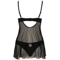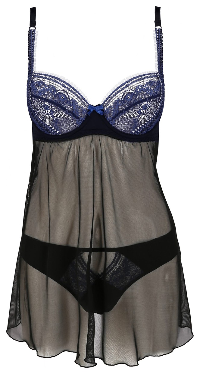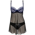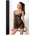 Полупрозрачная сорочка и трусики Gisele черного цвета, лиф декорирован мягкой сеточкой синего цвета. На спине застежка, бретели регулируются. В комплекте: сорочка, трусики.