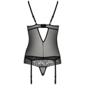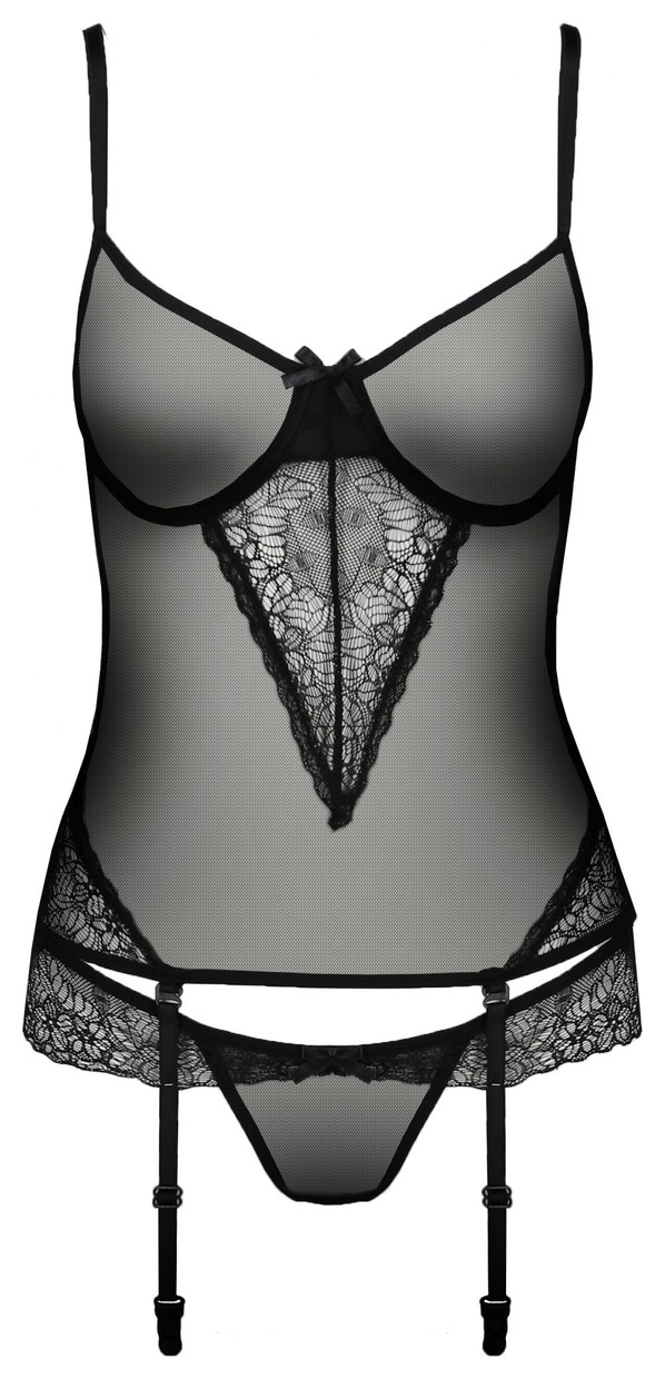 Эротический полупрозрачный корсаж и трусики Velia. Корсаж с подвязками для чулок, на спине застежка, бретели регулируются. Чулки в комплект не входят. В комплекте: корсаж, трусики-стринги.