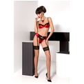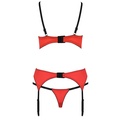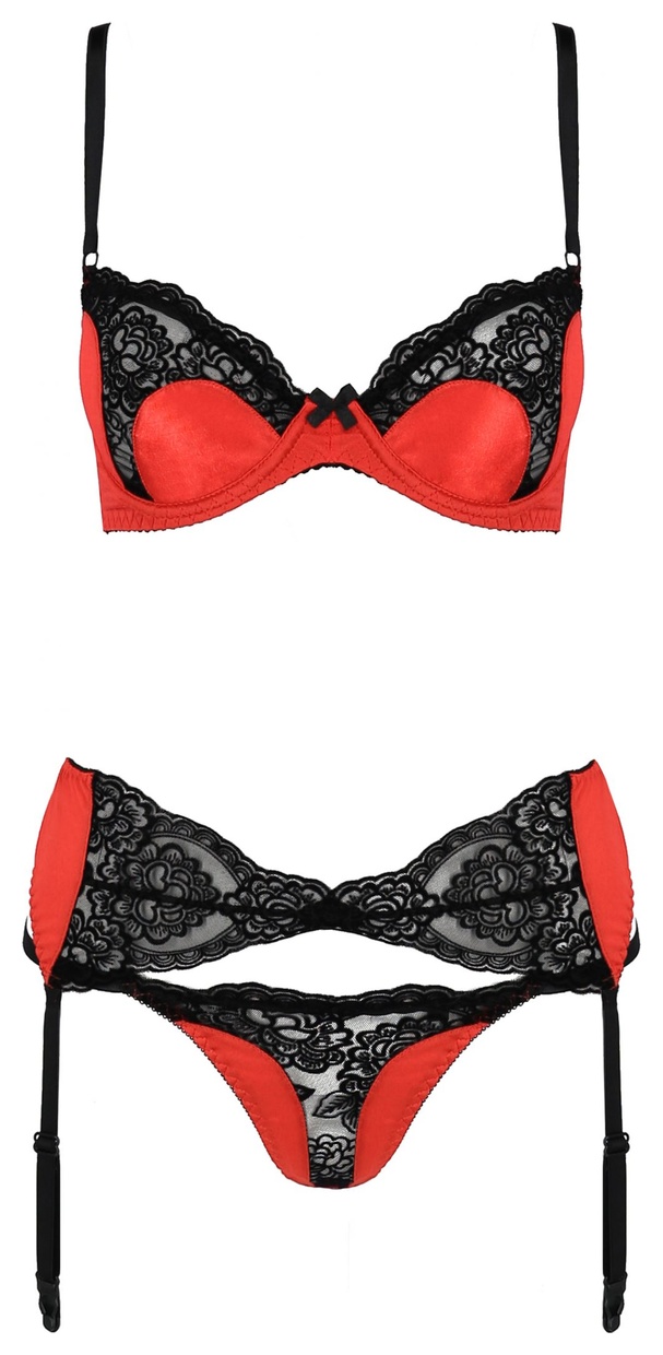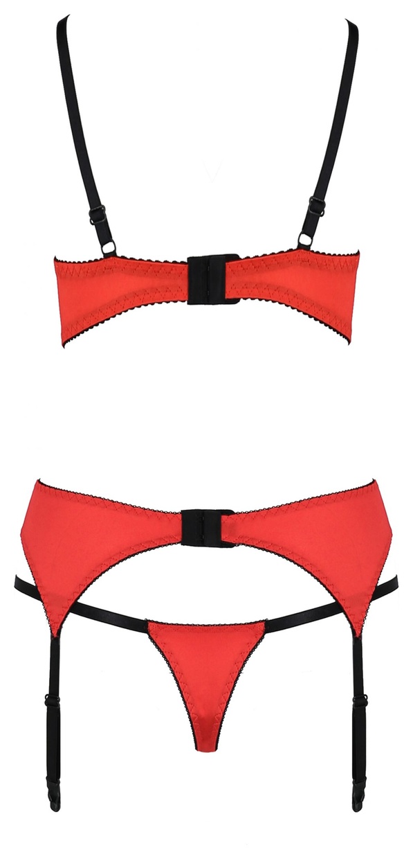 Комплект белья Polina красного цвета, декорирован красивым ажурным кружевом. Чулки в комплект не входят. В комплекте: бюстгальтер, пояс, трусики-стринги.