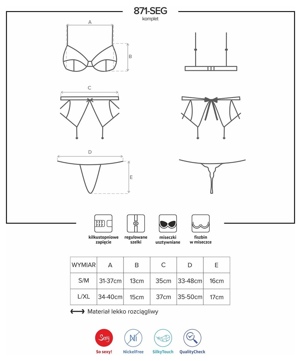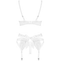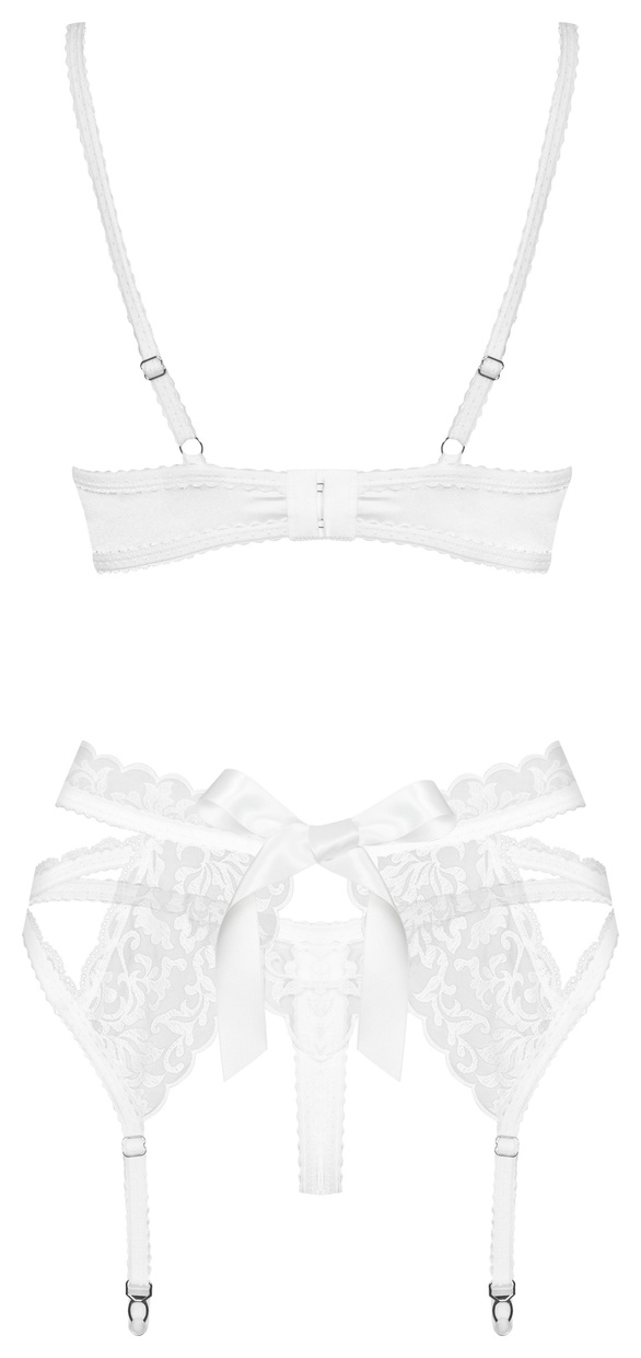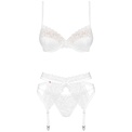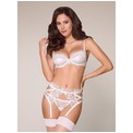 Комплект белья из бюстгальтера, пояса для чулок и стрингов. Бретели и подвязки регулируются по длине. Комплект выполнен из атласной ткани и тюля с декоративной вышивкой. В комплекте: бюстгальтер, трусики-стринги и пояс для чулок.