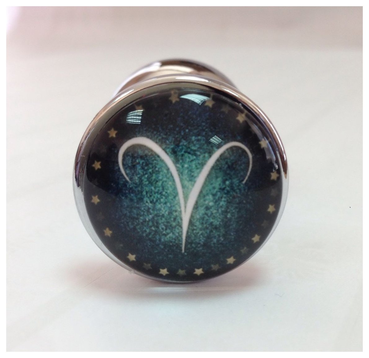 Серебристая анальная пробка с зеленым кристаллом и знаком зодиака - Овен