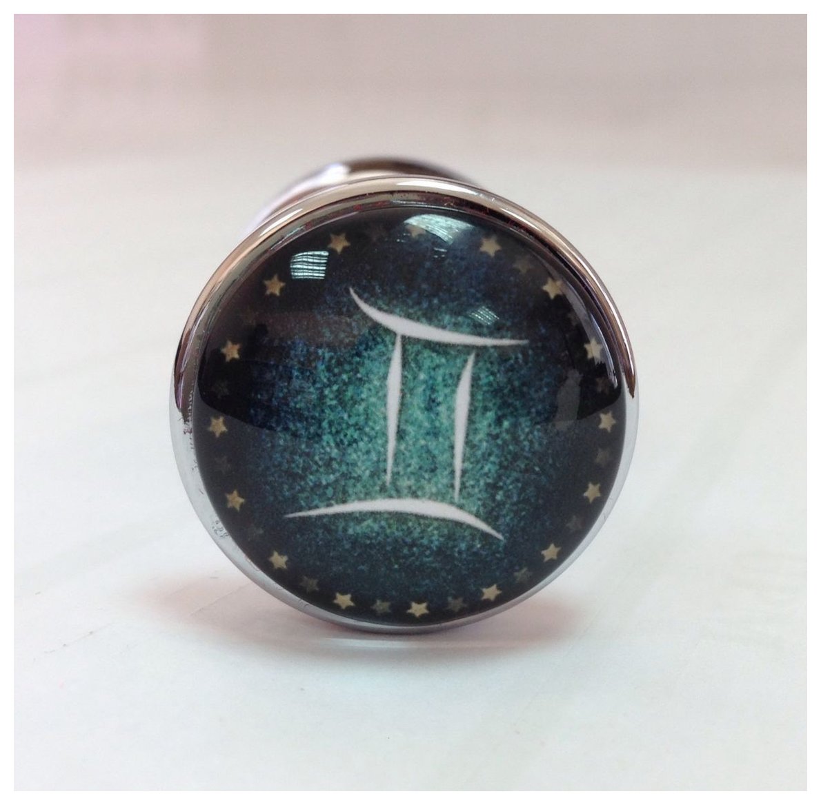 Серебристая анальная пробка с зеленым кристаллом и знаком зодиака - Близнецы