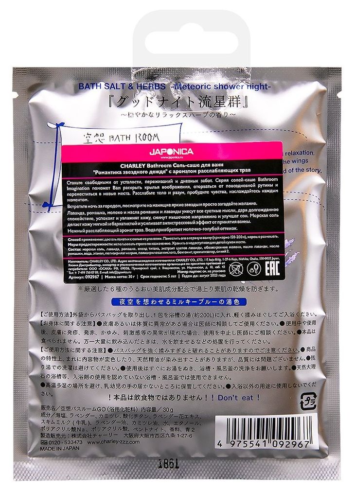 Станьте свободными от усталости, переживаний и дневных забот. Серия солей-саше Bathroom Imagination поможет Вам раскрыть крылья воображения, оторваться от повседневной рутины и переместиться в новые места. Расслабьте тело и разум, пробудите чувства, наслаждайтесь каждым моментом. Встретьте ночь за городом, посмотрите на манящие яркие звезды и просто загадайте желание. Лаванда, ромашка, молоко и масла ромашки и лаванды унесут все суетные мысли, даря долгожданное спокойствие, успокоят и увлажнят кожу, снимут мышечное напряжение и улучшат сон. Морская соль делает кожу мягкой и бархатистой и усиливает антистрессовый эффект от принятия ванны. Нежный расслабляющий аромат трав. Вода приобретает молочно-голубой оттенок.