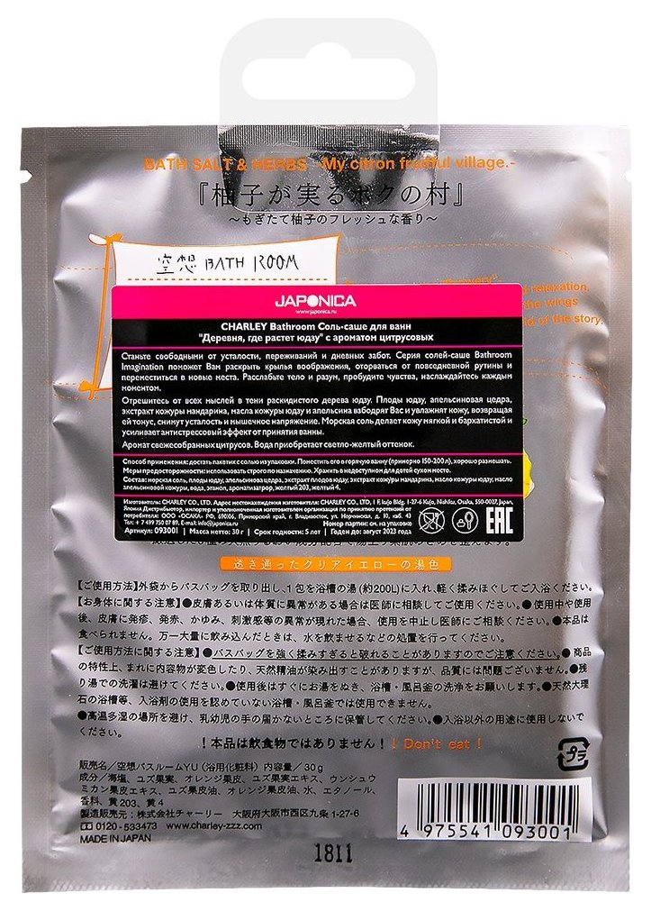Станьте свободными от усталости, переживаний и дневных забот. Серия солей-саше Bathroom Imagination поможет Вам раскрыть крылья воображения, оторваться от повседневной рутины и переместиться в новые места. Расслабьте тело и разум, пробудите чувства, наслаждайтесь каждым моментом. Отрешитесь от всех мыслей в тени раскидистого дерева юдзу. Плоды юдзу, апельсиновая цедра, экстракт кожуры мандарина, масла кожуры юдзу и апельсина взбодрят Вас и увлажнят кожу, возвращая ей тонус,снимут усталость и мышечное напряжение. Морская соль делает кожу мягкой и бархатистой и усиливает антистрессовый эффект от принятия ванны. Аромат свежесобранных цитрусов. Вода приобретает светло-желтый оттенок.