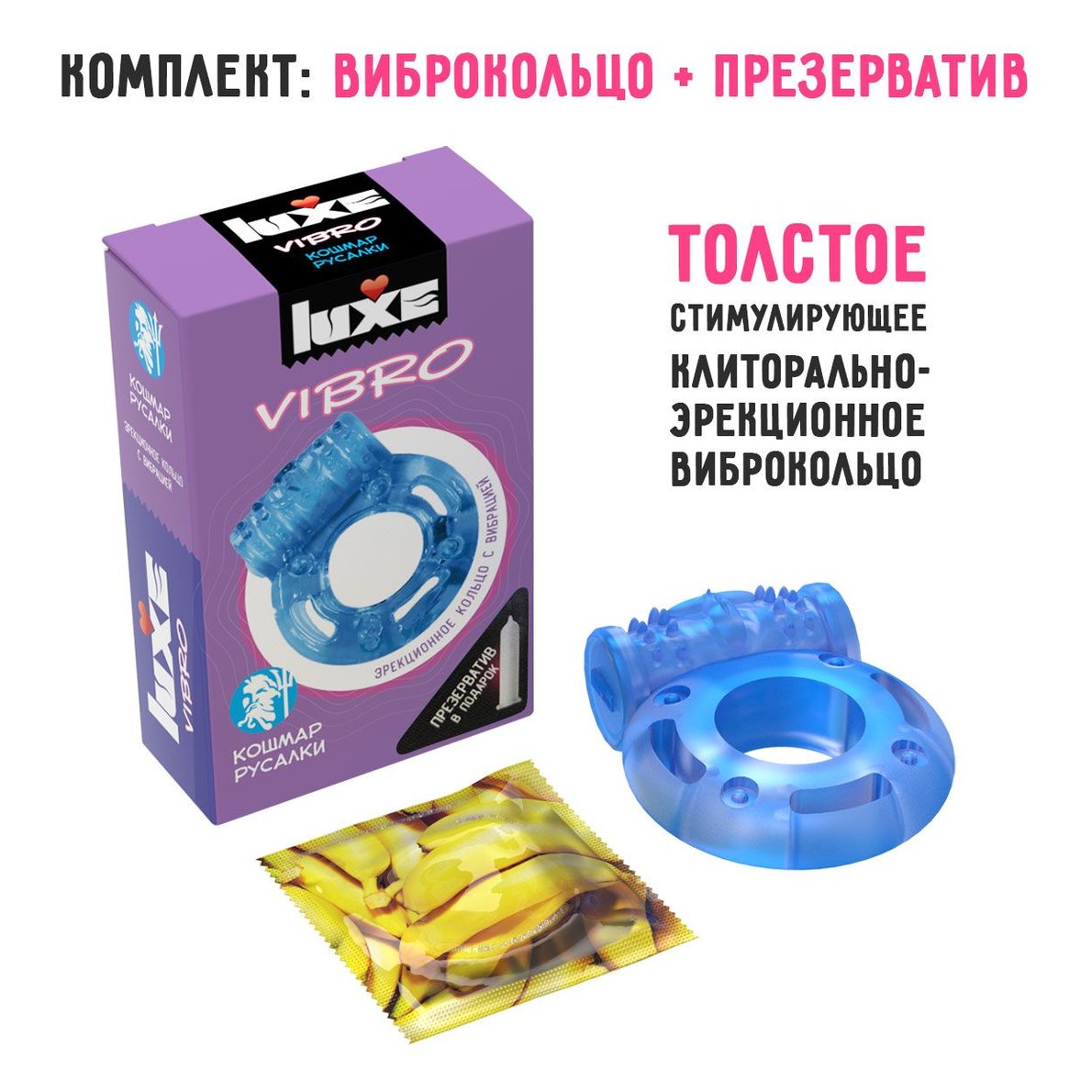 Голубое эрекционное виброкольцо Luxe VIBRO «Кошмар русалки» презерватив