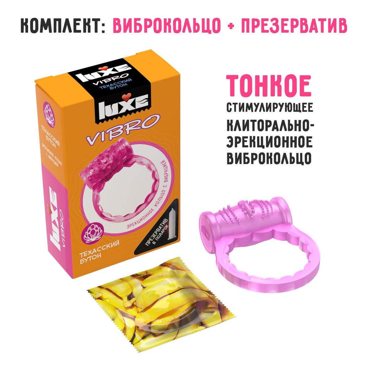 Розовое эрекционное виброкольцо Luxe VIBRO «Техасский бутон» презерватив