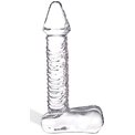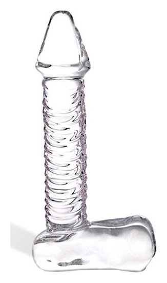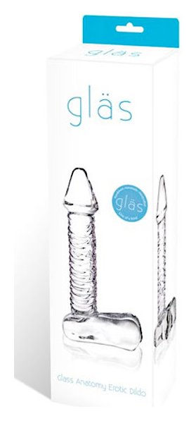 Фаллоимитатор из прозрачного стекла с рельефными венами на стволе, выполненный в розоватом оттенке. Длина фаллоса на платформе-мошонке: 17 см. Максимальный диаметр: 4,5 см.