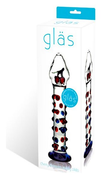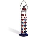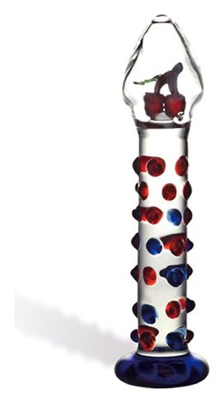 Прямой фаллос с ярким синим основанием покрыт объемными массажными точками красного и синего цвета. Но самое удивительное: внутри большой прозрачной головки две застывшие вишенки! Диаметр головки: 4 см. Диаметр ствола: 3 см. Общая длина фаллоса с ограничительным основанием: 18 см.