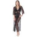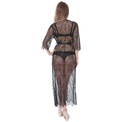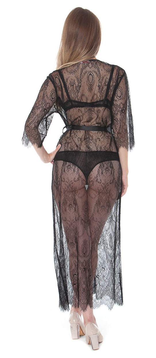 Женский домашний халат выполнен из кружевного полотна. Модель свободного силуэта на поясе. Изделие длиной макси. Борта халата окантованы шелком. Рукав прямой длиной 3/4. Трусики и бюстгальтер не входят в комплект!