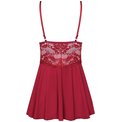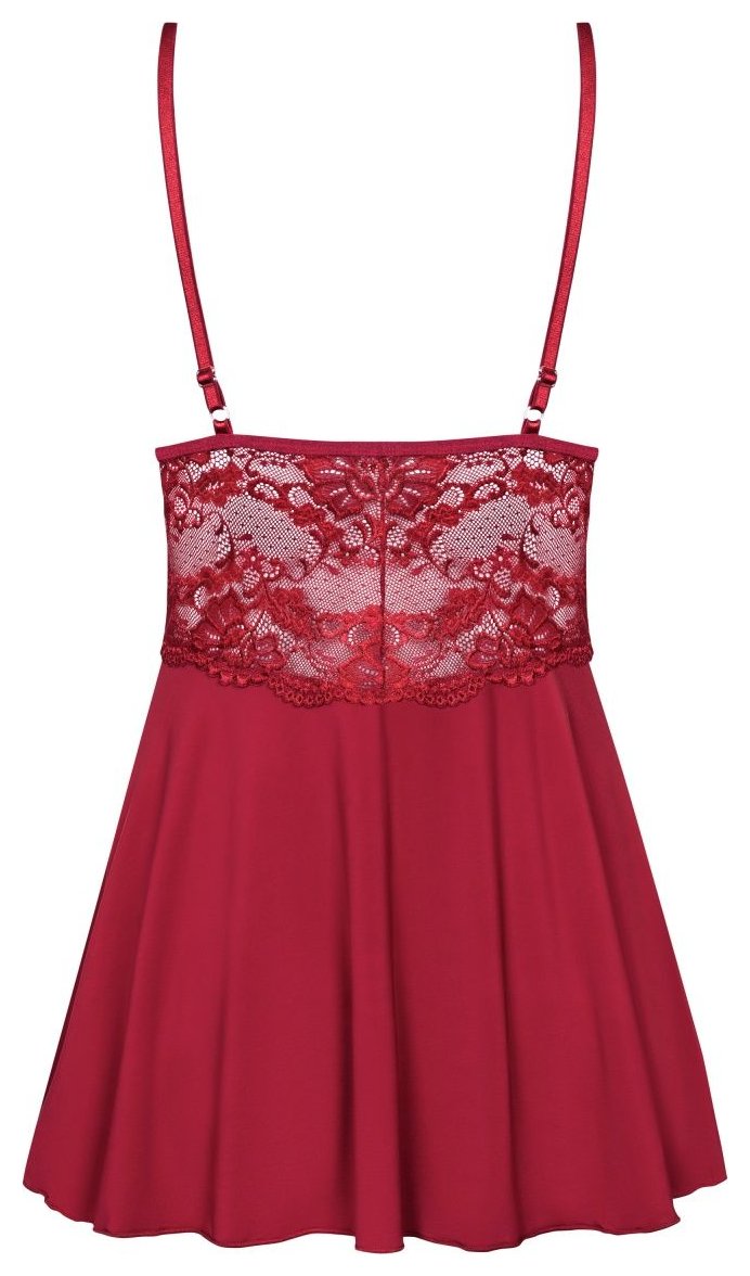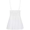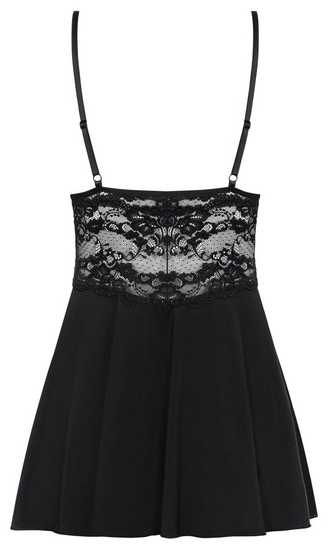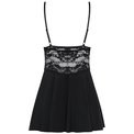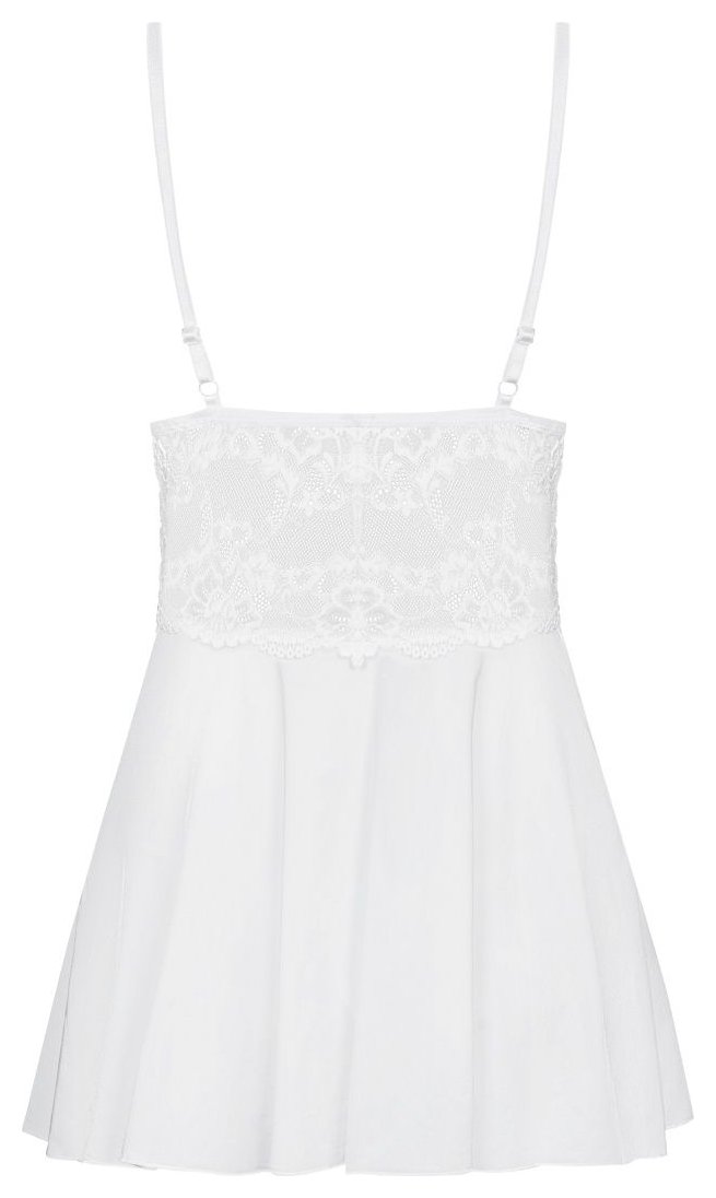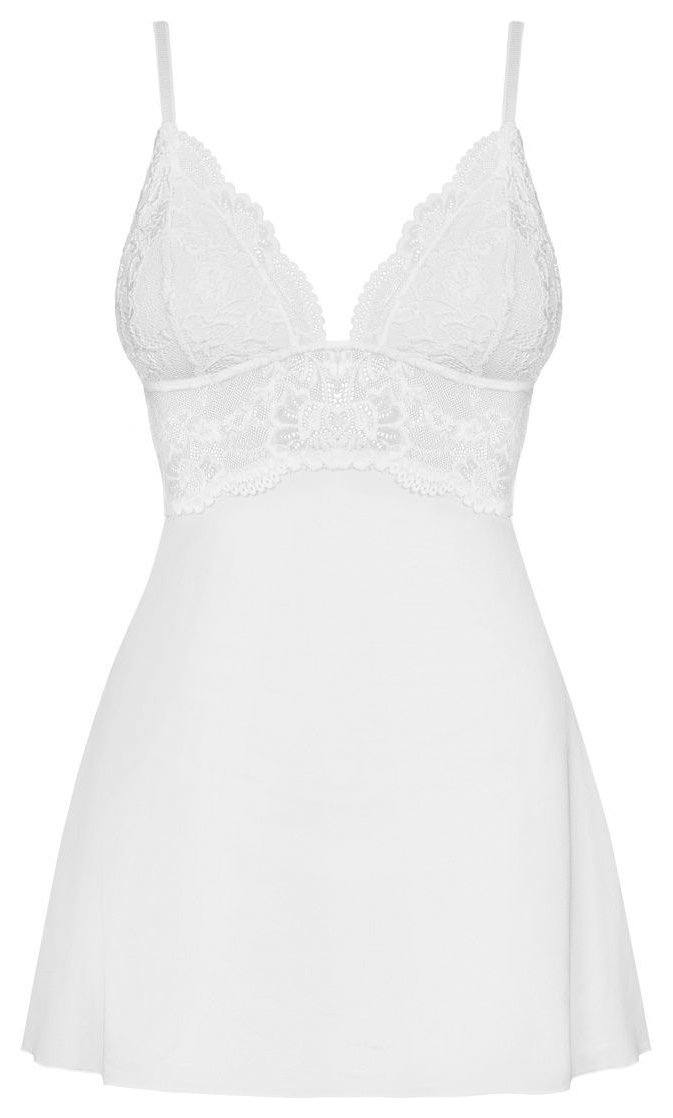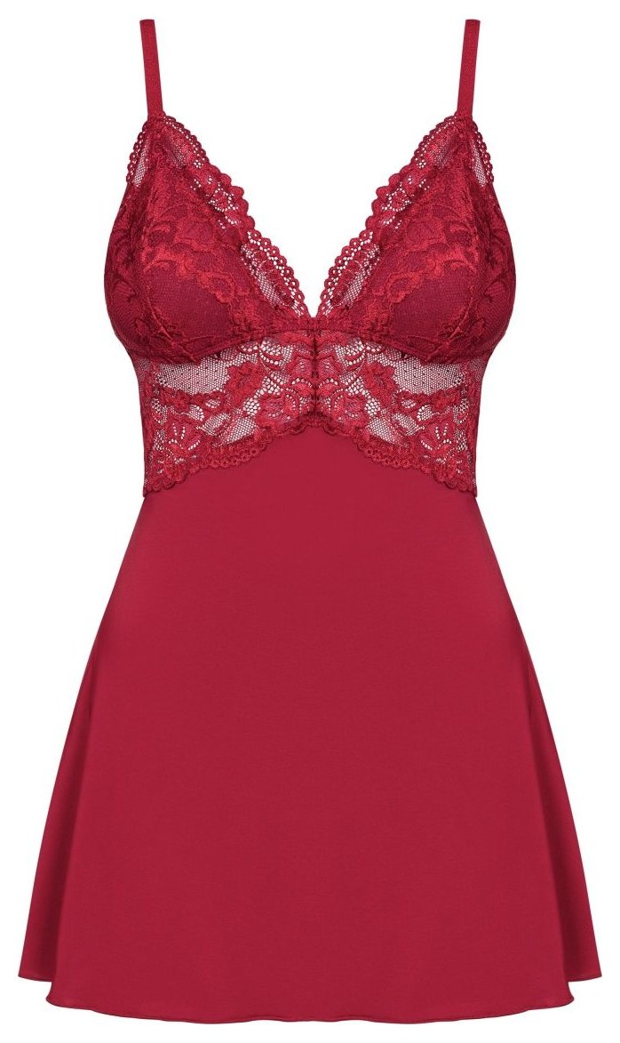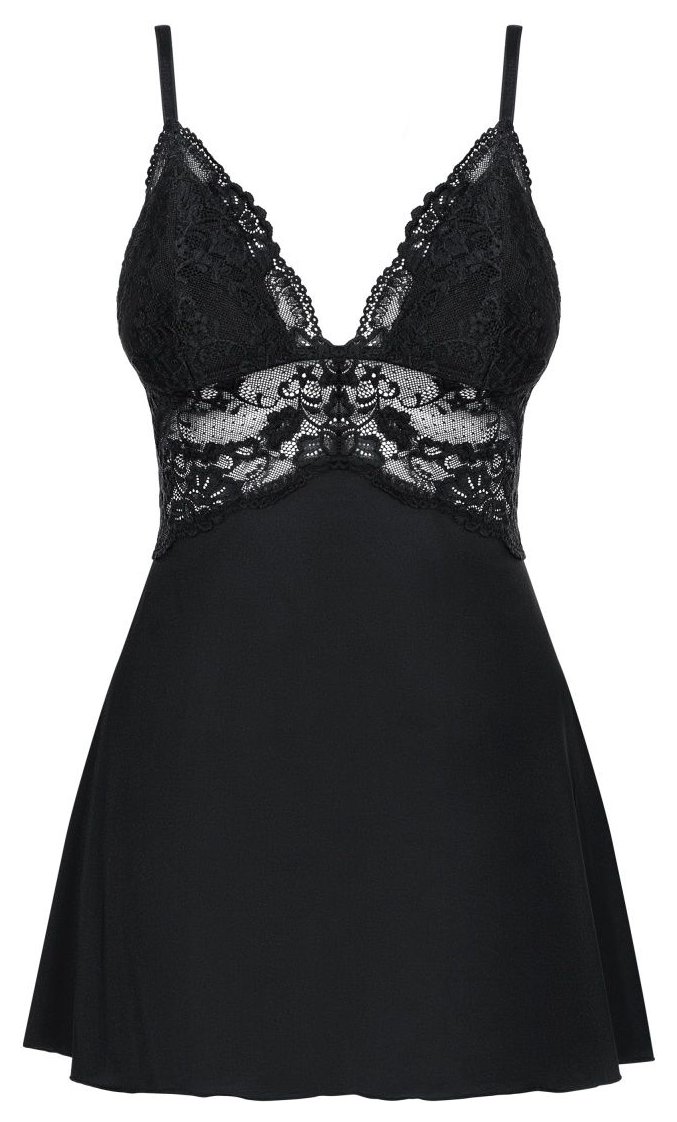 Элегантная сорочка с расклешенным силуэтом из стрейч-атласного материала, украшена кружевом. Чашка треугольная, плотная, поролон. В комплекте: сорочка и трусики-стринги.