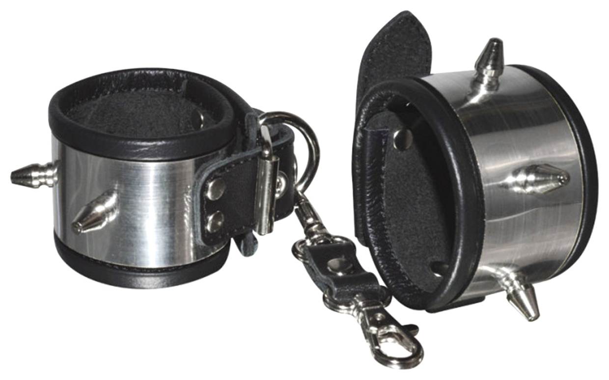 Серебристо-черные наручники с шипами и металлическим блеском.