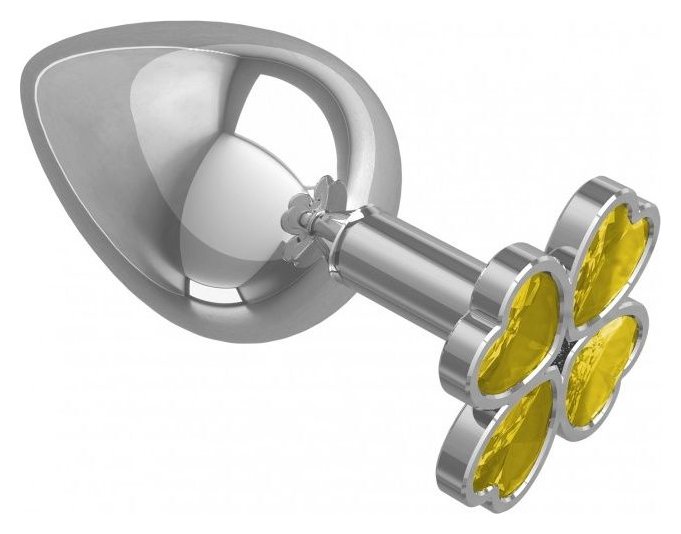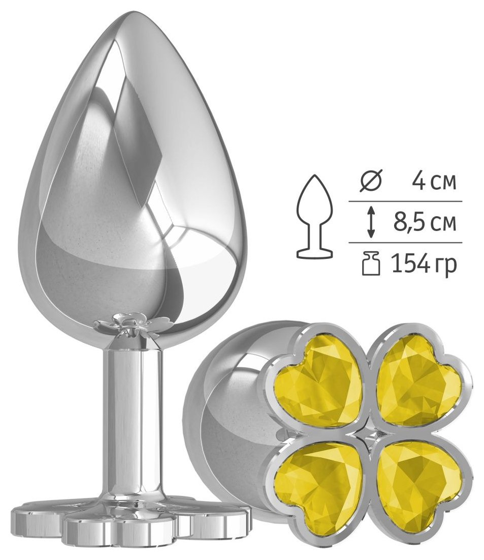 Большая серебристая анальная втулка с жёлтым клевером из кристаллов - 9,5 см