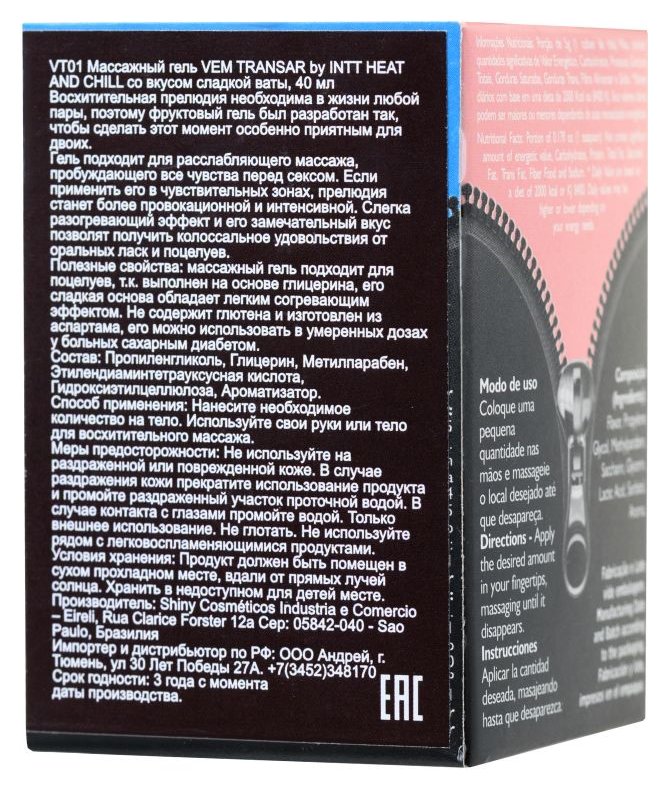 Искра. Буря. Экстаз. Может ли массаж подарить такое? Может, если это массажное масло для поцелуев Intt Vem Transar heat and chill со вкусом сахарной ваты. Позволяет экспериментировать. Поскольку масло обладает разогревающим эффектом и предназначено для поцелуев, можно не ограничивать себя в сценариях интимных игр. Нанесите Intt Fruit Sexy на тело, поцелуйте несколько чувствительных точек и подуйте на них в течение 3 секунд — возбуждение не заставит себя долго ждать. Провоцирует желание. Аппетитный аромат сладкой ваты создает игривое настроение и помогает расслабиться. Абсолютно безопасная и протестированная формула без сахара и глютена подходит даже аллергикам и диабетикам. Не оставляет ощущения липкости и легко смывается водой.INTT — удовольствие в каждой капле.