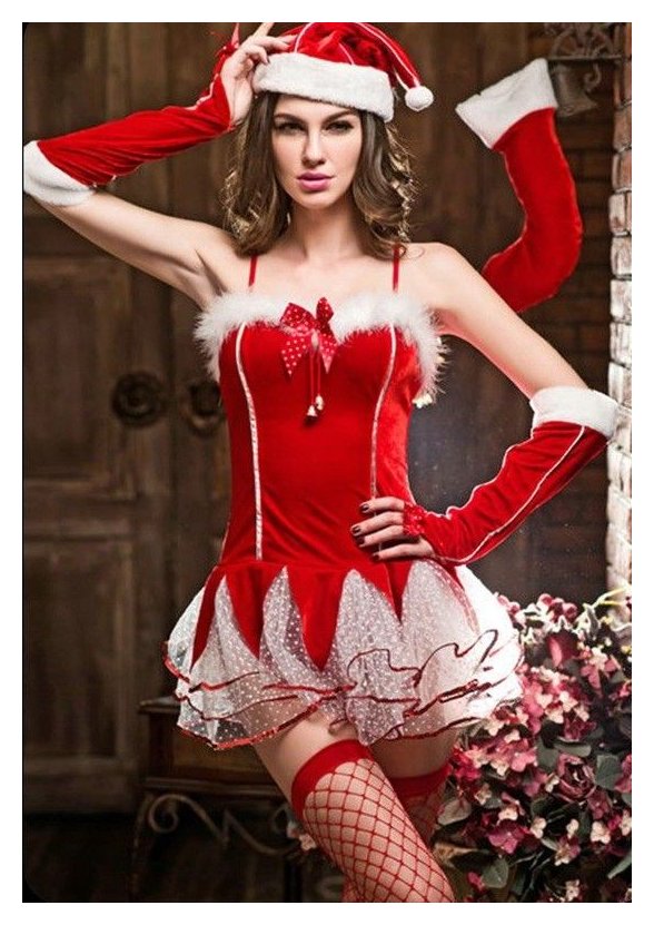 Мини платье приталенного силуэта из стрейч-велюра на съемных регулируемых по длине бретелях с отрезной юбочкой . Без застежки. По линии груди отделка из лебяжьего пуха и незатейливого бантика с колокольчиками. Низ выполнен в виде воланов из тюля, низ каждого из трех воланов отделан пайетками. В комплекте: платье, шапочка, перчатки с открытыми пальчиками, чулки-сетка, трусики-стринги.