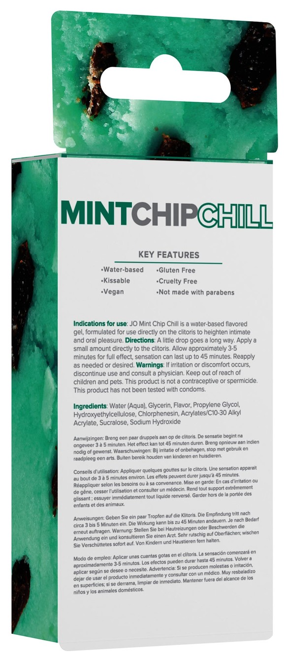 JO Mint Chip Chill – стимулирующее косметическое средство на водной основе с ярким свежим вкусом мяты и шоколада. Гель обеспечит легкое, как дуновение ветра, охлаждающее покалывание мяты превращается в тающее тепло насыщенного шоколада. Стимулирующее средство абсолютно безопасно для орального применения. Идеально подходит для орального секса и прелюдии. Специальная формула активирует вашу чувствительность с помощью сочетания охлаждающего покалывания и повысит чувствительность интимной зоны.