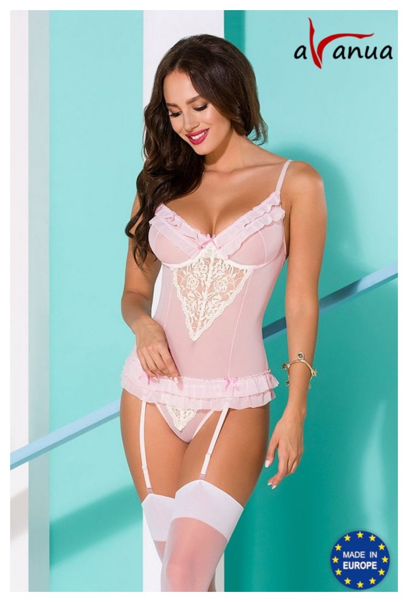 Эротический полупрозрачный корсаж Sisi. Чашечки мягкие на косточках, бретели регулируются. Корсаж декорирован красивым кружевом и рюшами. В комплекте: корсаж и трусики-стринги.