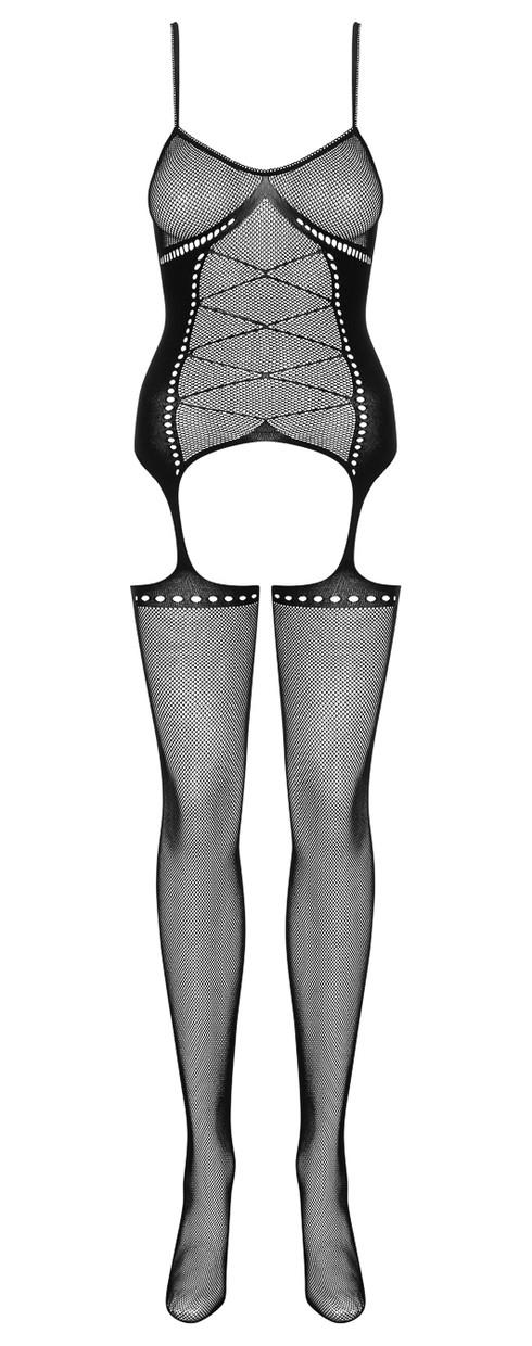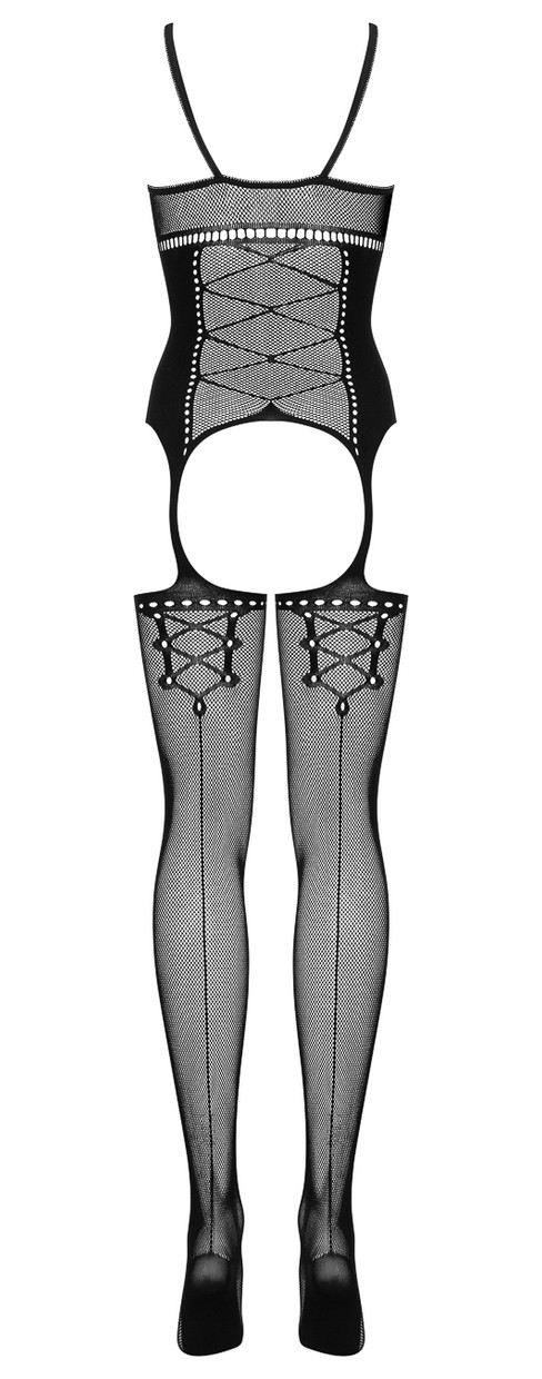 Этот комбинезон с интимным доступом не назовешь одним лишь словом. Потому как он и романтичный, и сексуальный, и роскошный! Выполненный из мелкой сетки, он имеет массу оригинальный деталей. Это и непрозрачные участки по бокам топа, и перфорация как на верхней части чулок, так и по всему топу, и имитация шнуровки – спереди и сзади на верхней части, а также сзади на чулочной. Завершают образ пикантные стрелки.