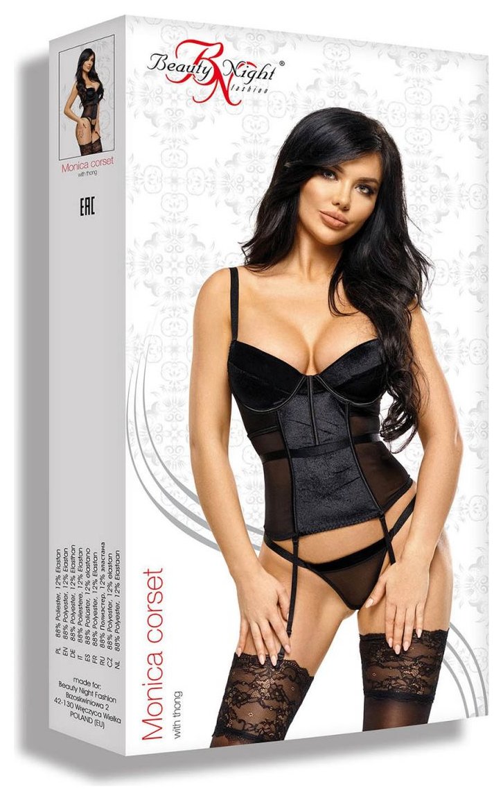 Эротический корсаж Monica выполнен из мягкого велюра с сочетании с нежным тюлем. Лиф на косточках, бретели и подвязки для чулок регулируются. Спинка выполнена из эластичных стреп-лент. В комплекте: корсаж и трусики-стринги.
