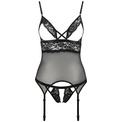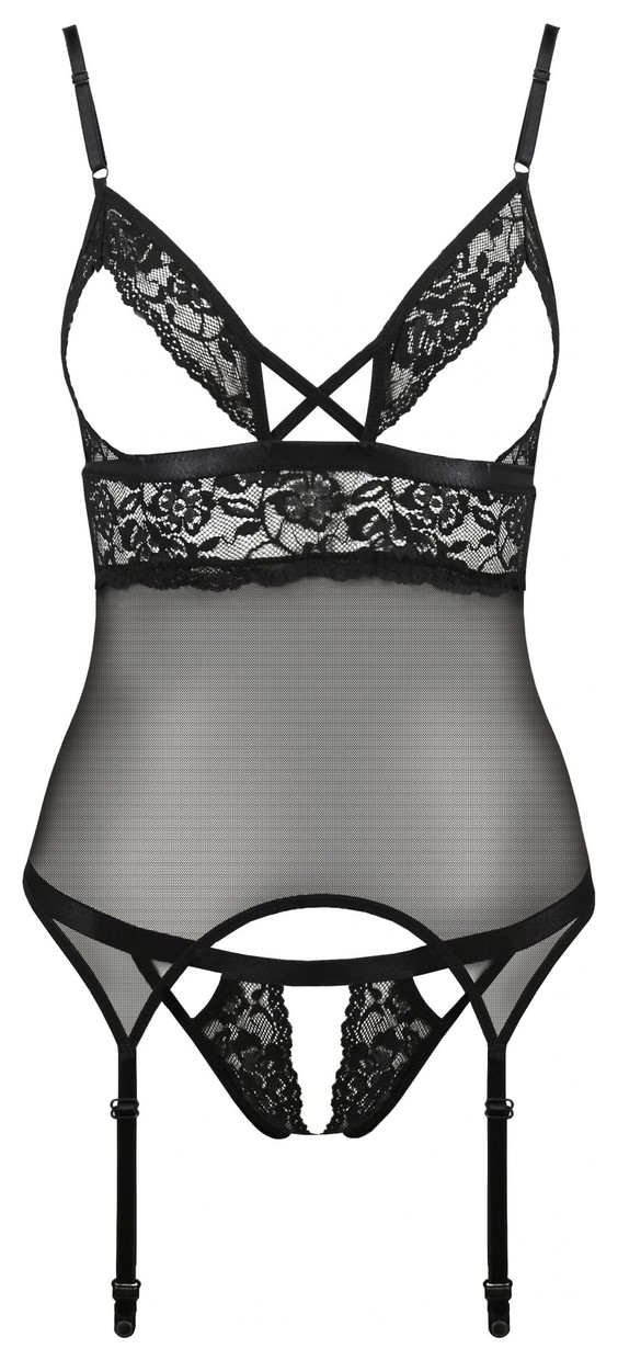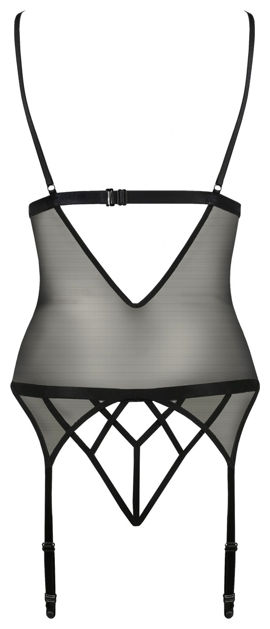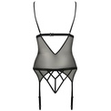 Эротический корсаж Diabolina с подвязками для чулок, выполнен из полупрозрачного тюля в сочетании с эластичным кружевом. Лиф открытый без косточек, бретели и подвязки регулируются по длине, на спинке нерегулируемая застежка. В комплекте: корсаж и трусики-стринги.