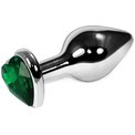Серебристая анальная пробка с зеленым кристаллом-сердцем - 9 см