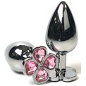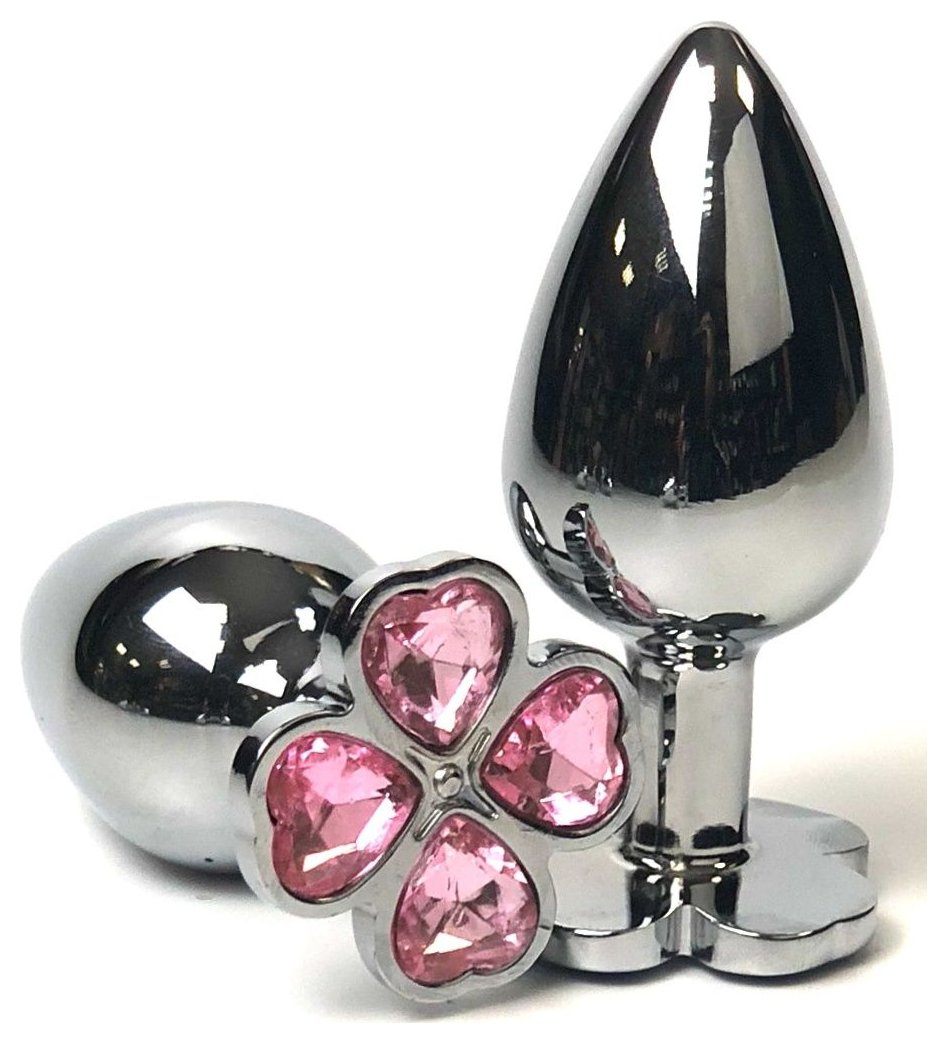 Серебристая анальная втулка с клевером из нежно-розовых кристаллов - 9 см
