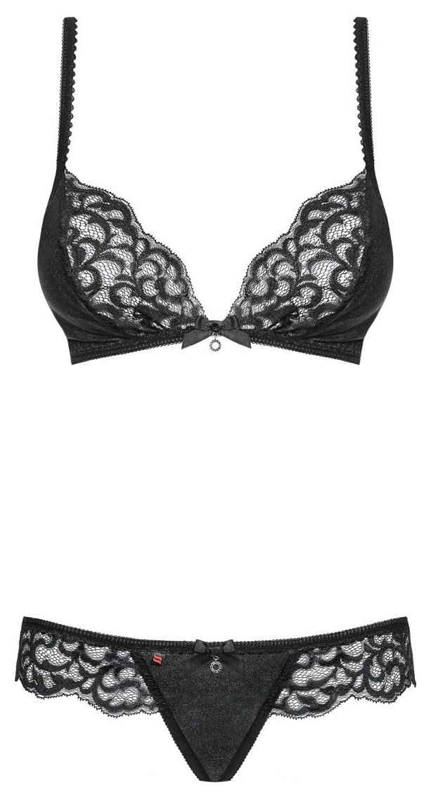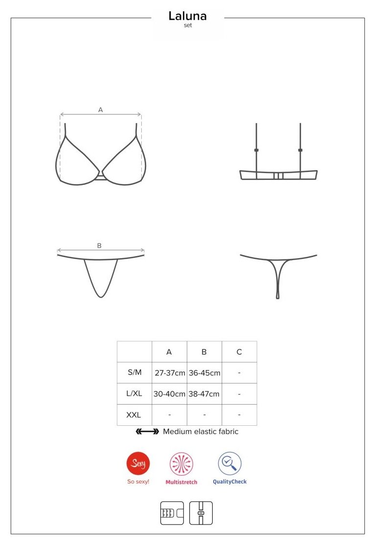 Роскошный комплект белья Laluna состоит из бюстгальтера и трусиков, выполнен из эластичной блестящей ткани и красивого кружева. Лиф мягкий без косточек, бретельки и застежка на спинке регулируются. Трусики сзади украшены пикантными вырезами. В комплекте: бюстгальтер и трусики.