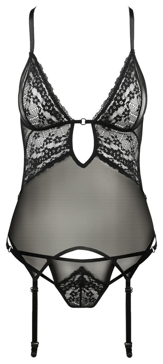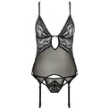 Элегантный корсаж классического кроя из прозрачной вуали и нежного кружева. Мягкие чашечки и разрез под ними акцентируют внимание на зоне декольте. Бретели перекрещиваются сзади и регулируются по длине для идеальной посадки по фигуре. Глубокий округлый вырез на спине выглядит очень соблазнительно. Регулируемые пажи для чулок позволяют носить корсаж с чулками. Прозрачные трусики также украшены кружевом. В комплекте: корсаж и трусики-стринги.