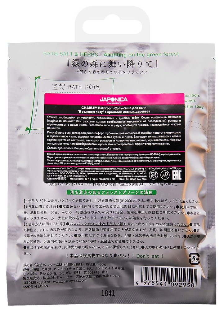 Станьте свободными от усталости, переживаний и дневных забот. Серия солей-саше Bathroom Imagination поможет Вам раскрыть крылья воображения, оторваться от повседневной рутины и переместиться в новые места. Расслабьте тело и разум, пробудите чувства, наслаждайтесь каждым моментом. Расслабьтесь в умиротворяющей атмосфере глубокого хвойного леса. В этом Вам помогут кипарисовое и терпенитное масла, экстракт кипариса, листья хурмы и гинко. Благодаря им подтягивается кожа и нормализуется её состояние, снимается усталость и мышечное напряжение, улучшается сон. Морская соль делает кожу мягкой и бархатистой и усиливает антистрессовый эффект от принятия ванны. Свежий аромат леса. Вода приобретает зеленый оттенок.