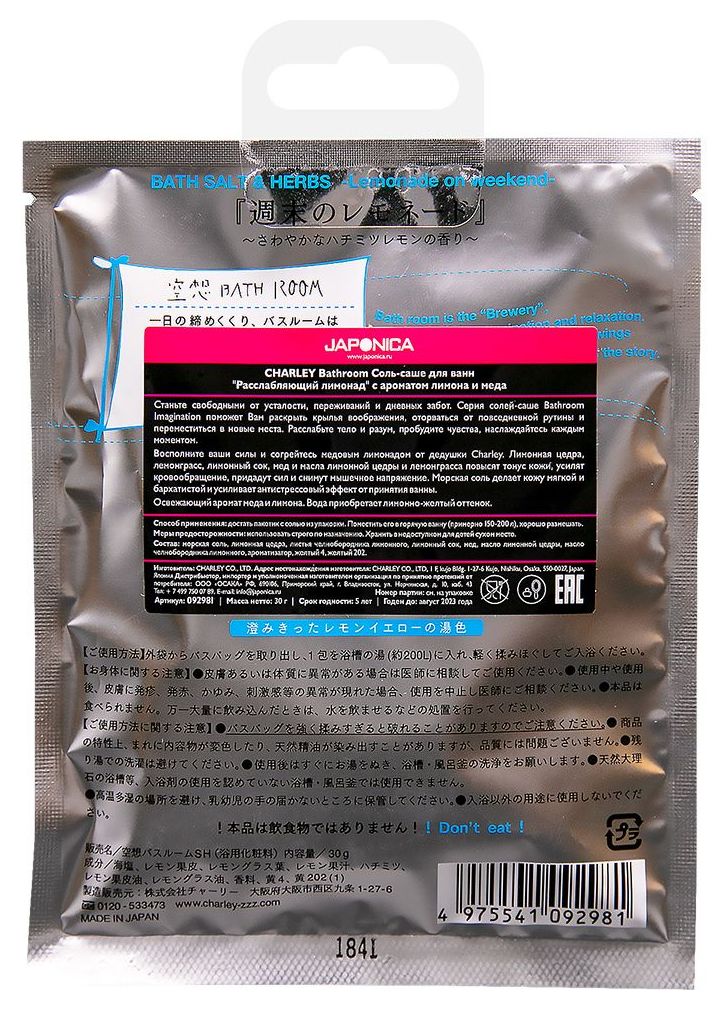 Станьте свободными от усталости, переживаний и дневных забот. Серия солей-саше Bathroom Imagination поможет Вам раскрыть крылья воображения, оторваться от повседневной рутины и переместиться в новые места. Расслабьте тело и разум, пробудите чувства, наслаждайтесь каждым моментом. Восполните ваши силы и согрейтесь медовым лимонадом от дедушки Charley. Лимонная цедра, лемонграсс, лимонный сок, мед и масло лимонной цедры и лемонграсса повысят тонус кожи, усилят кровообращение, придадут сил и снимут мышечное напряжение. Морская соль делает кожу мягкой и бархатистой и усиливает антистрессовый эффект от принятия ванны. Освежающий аромат меда и лимона. Вода приобретает лимонно-желтый оттенок.
