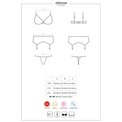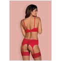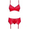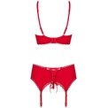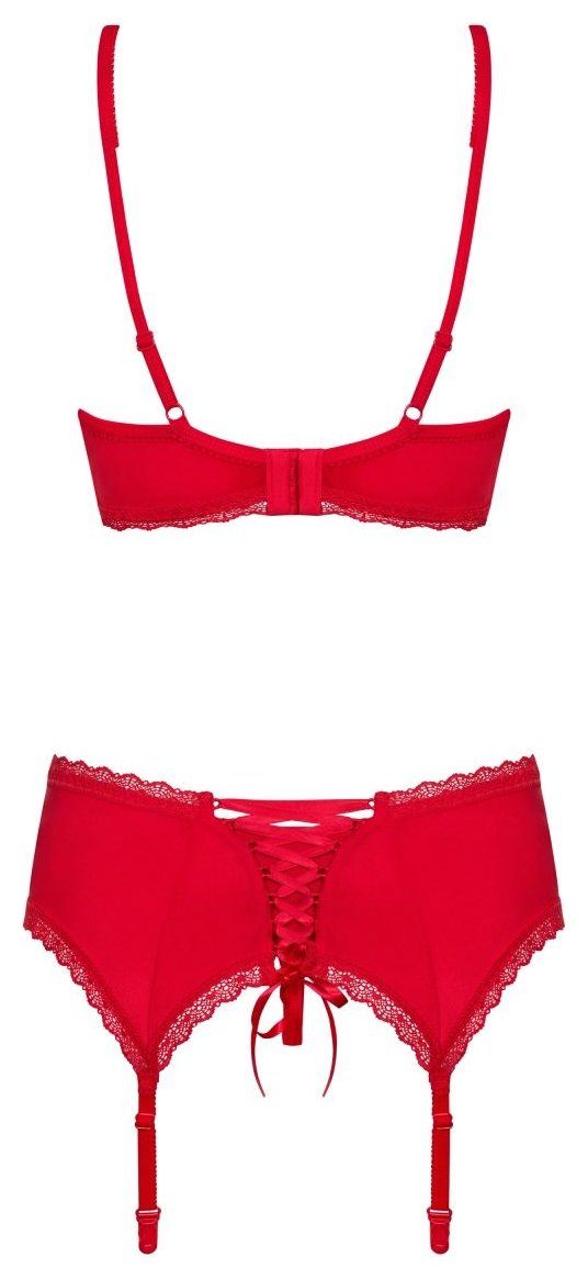 Страстный комплект белья из трех предметов. Бюстгальтер предназначен для полного бюста. Косточки и поролоновая вставка в нижней части великолепно моделируют грудь. Мягкое кружево в верхней части бюста декорировано узором. Между чашечек украшение в форме сердечка со стразом и атласный бантик. Три ряда застежек крючков сзади обеспечивают дополнительный комфорт и прекрасное прилегание. Бретели регулируются по длине. Широкий пояс выполнен из гладкой эластичной ткани и узорчатого кружева. Сзади дополнен игривой атласной шнуровкой. Спереди также украшен подвеской и бантиком. Четыре пажа регулируются по длине. В комплекте: бюстгальтер, трусики-стринги, пояс для чулок.