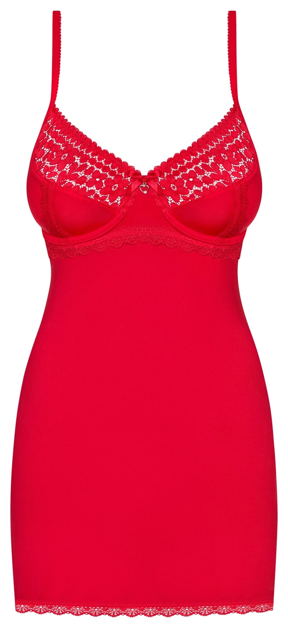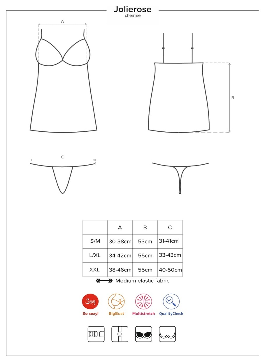 Кокетливая облегающая сорочка Jolierose выполнена из эластичного материала в сочетании с очаровательным кружевом. Лиф сорочки мягкий, на косточках, бретели регулируются по длине. В комплекте: сорочка и трусики-стринги.
