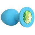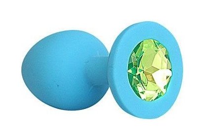 Голубая силиконовая анальная пробка с салатовым кристаллом - 9,5 см
