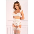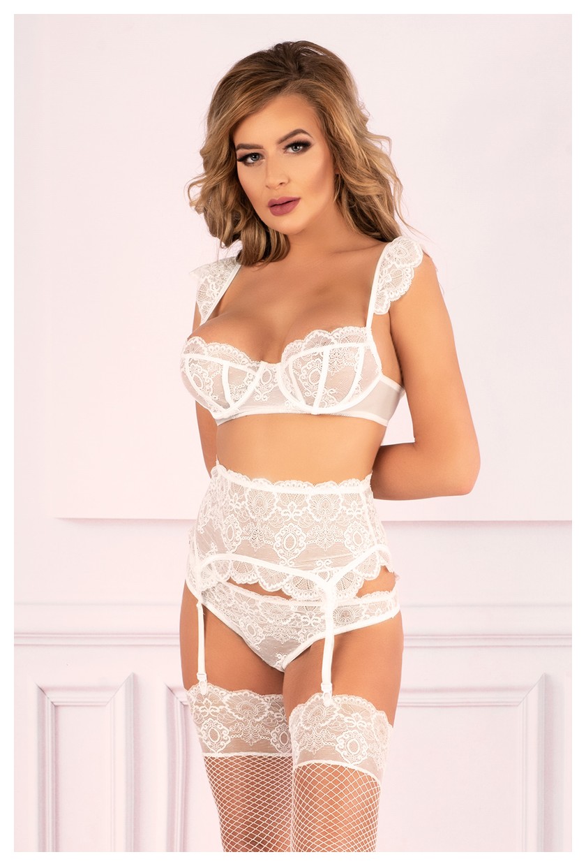 Эротичный кружевной комплект белья из четырех элементов. Бюстгальтер с мягкими получашечками на косточках и широко посаженные бретели с игривыми крылышками акцентируют внимание на зоне декольте. Сзади застежка на крючки, бретели регулируются. Широкий пояс для чулок с посадкой на талии и четырьмя пажами для чулок украшен оборками и цветочным орнаментом. Трусики-танга и чулки в сеточку с кружевной коронкой гармонично вписываются в комплект. В комплекте: бюстгальтер,трусики-танга, пояс для чулок, чулки.