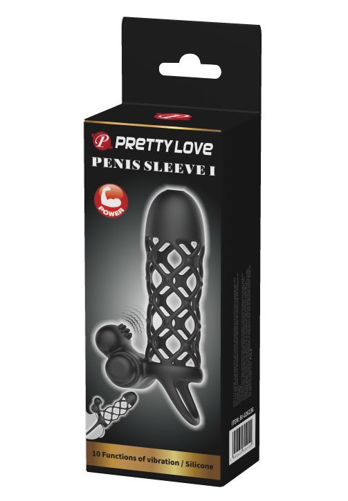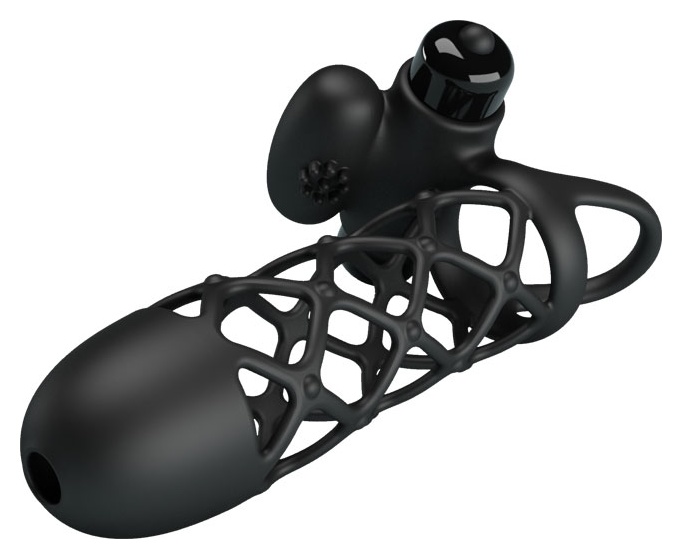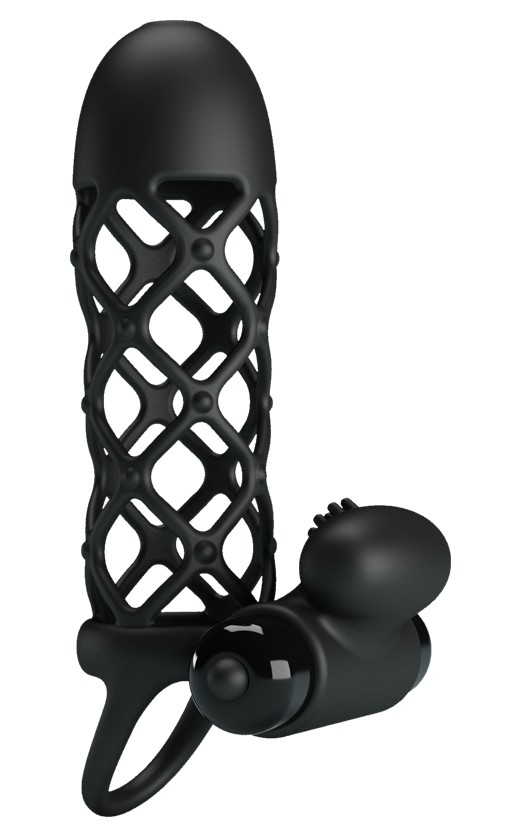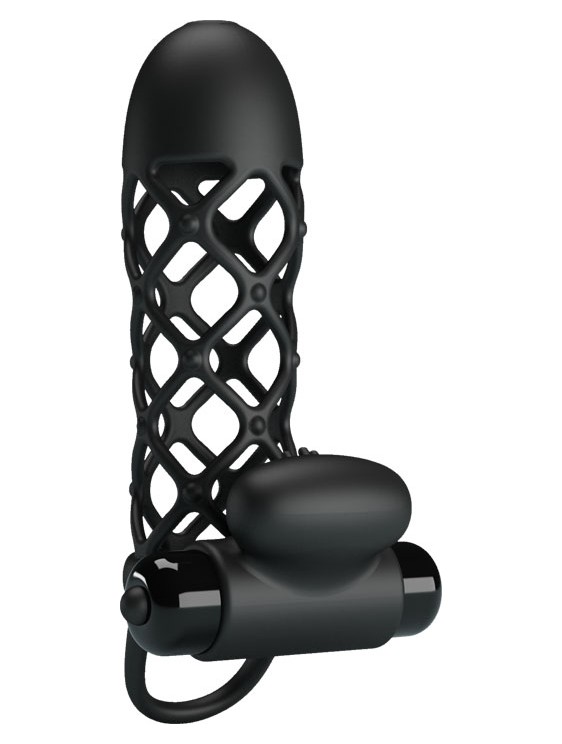 Черная насадка-сетка на пенис Penis Sleeve I. Насадка на пенис с вибратором для клитора, имеет кольцо под мошонку. Рабочая длина - 11,5 см. Внутренний диаметр - 3 см.