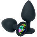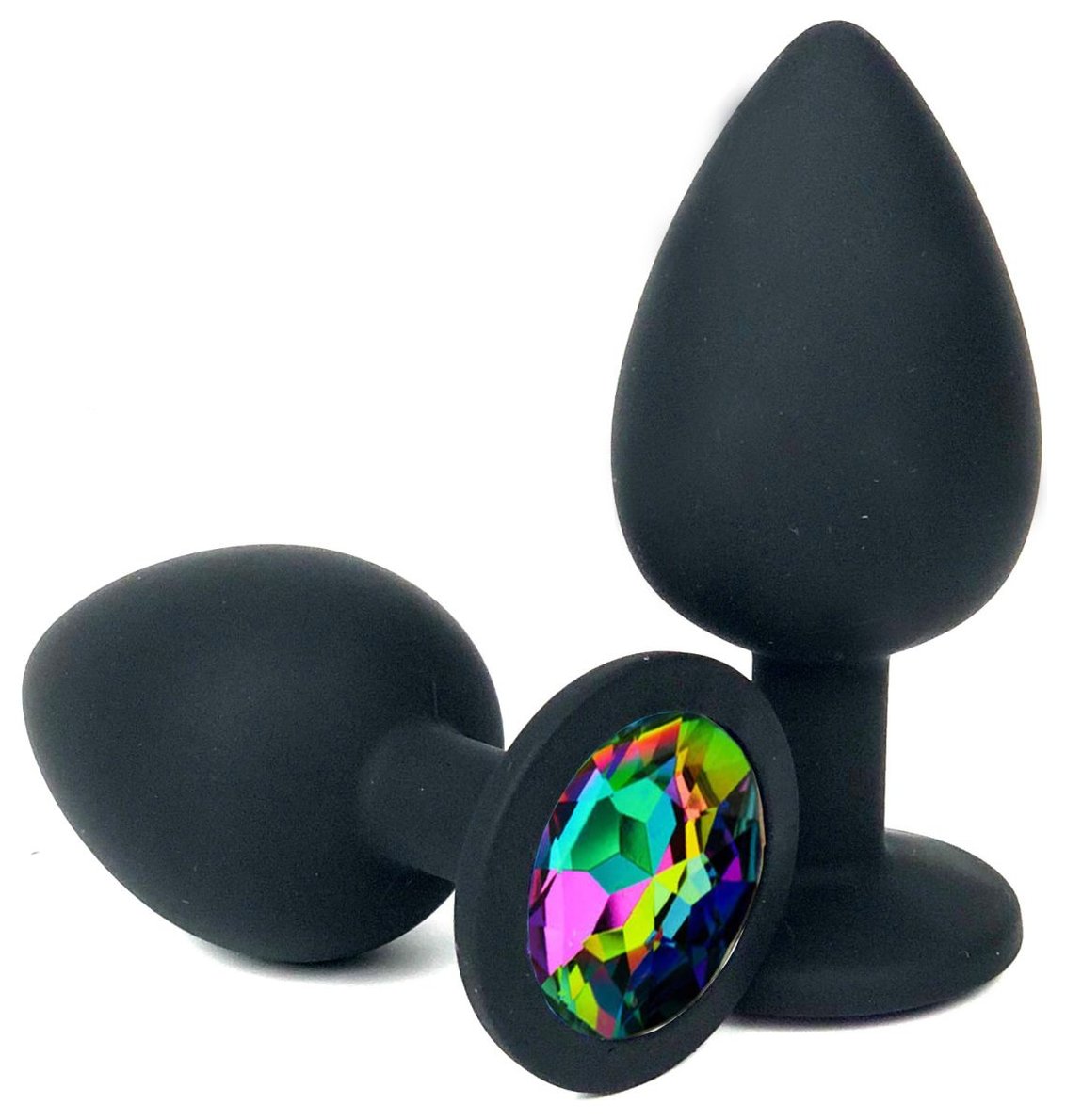 Черная силиконовая анальная пробка с радужным стразом - 7 см