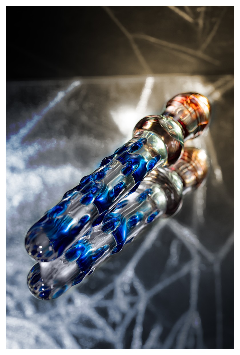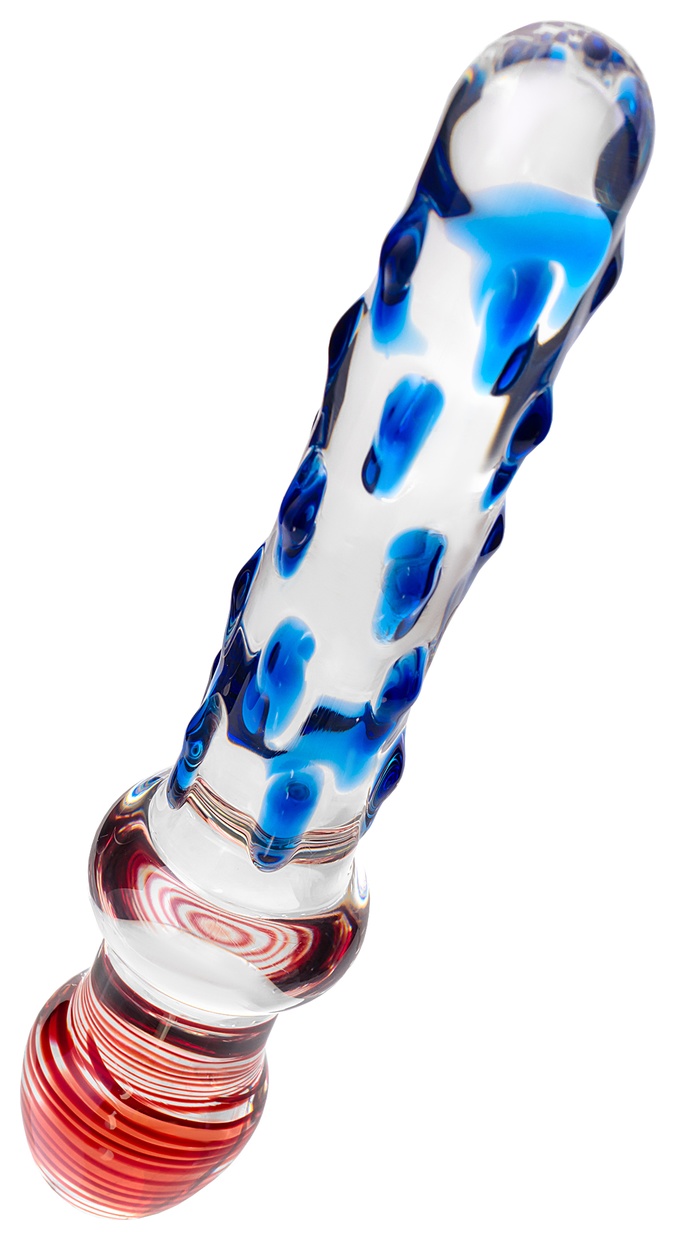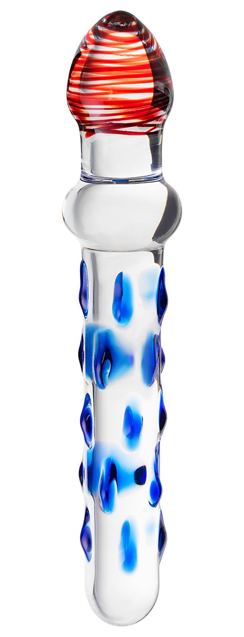 Этот стеклянный фаллос позволит вам почувствовать себя настоящим экспериментатором. Ведь у него две стороны – разных как по форме, так и по рельефу. Захотите, и в вас вторгнется большая, чуть заострённая головка с красными спиралями внутри. Или гладенький ствол, сплошь покрытый продолговатыми голубыми шишечками. Каким бы ни был выбор, ярким ощущениям – быть!