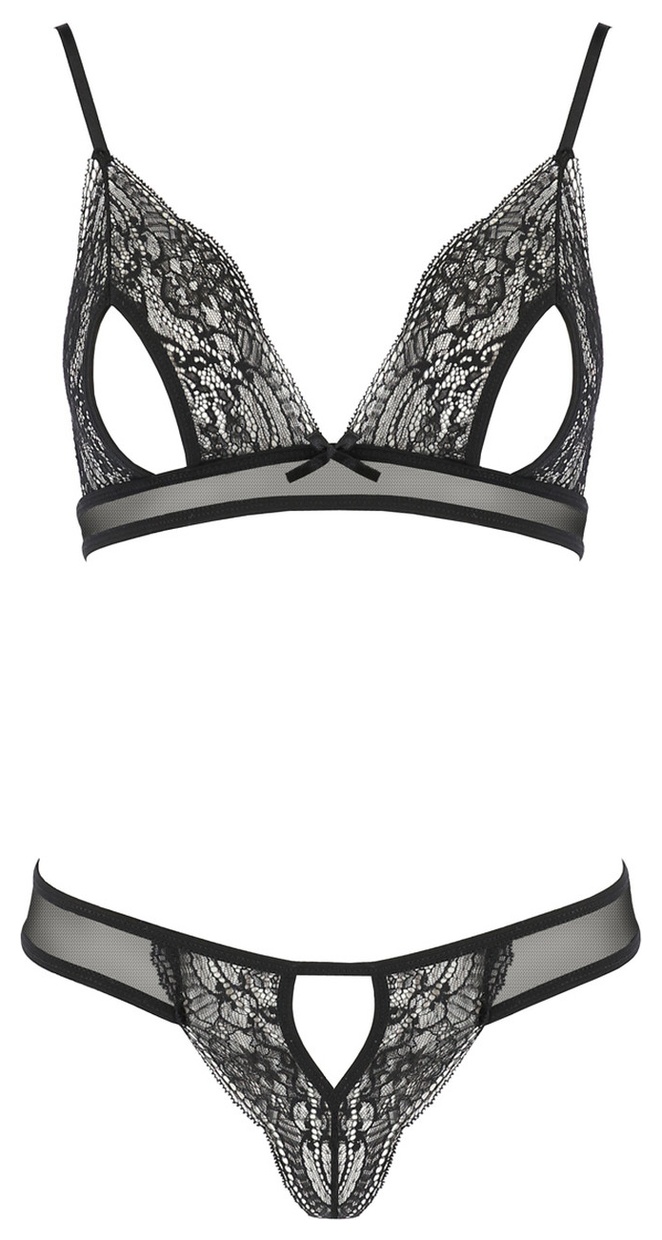 Соблазнительный комплект белья Vendi выполнен из полупрозрачного тюля и эластичного гипюра с цветочным узором. Комплект состоит из бюстгальтера с мягкой чашкой без косточек и трусиков-стринг. Бретели и застежка на спинке регулируются. Бюстгальтер и трусики декорированы пикантными разрезами. В комплекте: бюстгальтер, трусики.