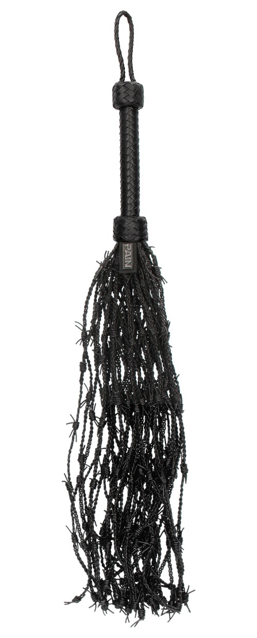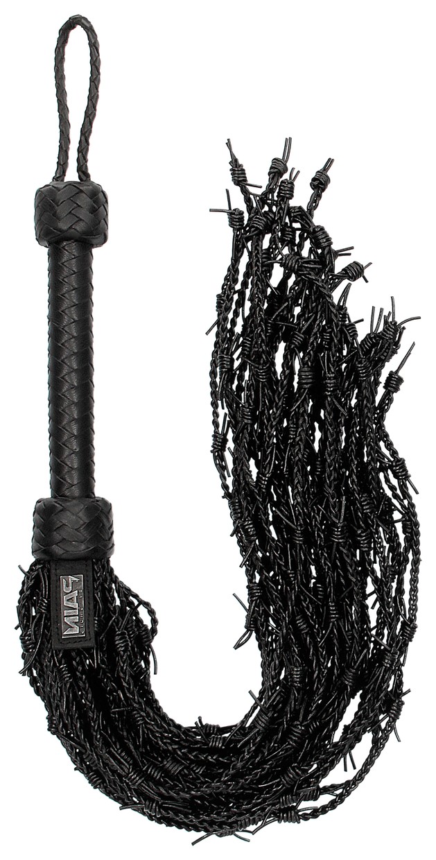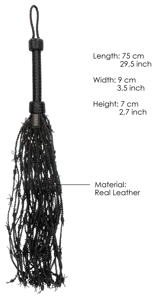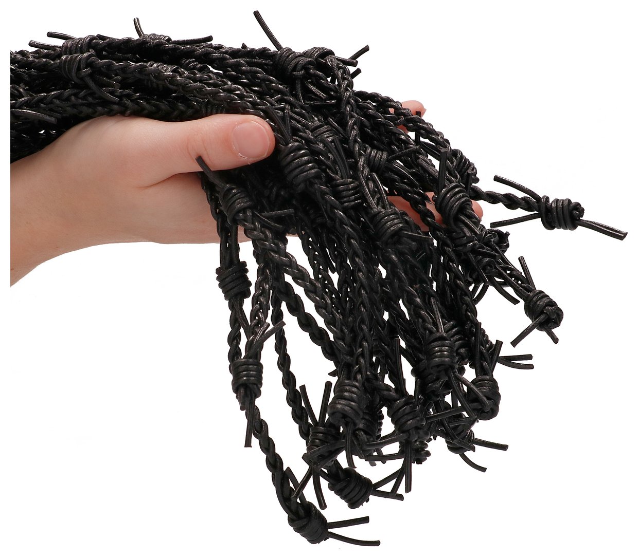 Многохвостая плетеная плеть Leather Barbed Wire Flogger. Эта красиво сделанная плеть с колючей проволокой из настоящей кожи LEATHER BARBED-WIRE FLOGGER вселит своим пугающим дизайном в вашего саба страх. Встроенные кожаные колючки будут царапать и щекотать при легком применении, но при более тяжелой руке они являются силой, с которой надо считаться. Эта плеть из высококачественной настоящей кожи состоит из 36 тонко сплетенных хвостов с узлами из колючей проволоки. Эта плеть с изысканной непроскальзывающей ручкой и петлей на запястье для обеспечения оптимального контроля - прекрасное дополнение к любой БДСМ-коллекции! Длина рукояти - 24 см.