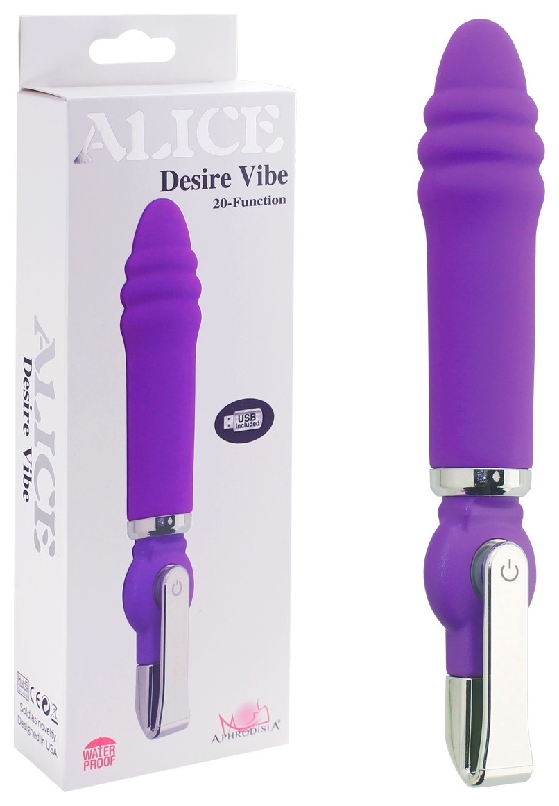 Компактный водонепроницаемый фиолетовый вибратор ALICE 20-Function Desire Vibe, заряжается от USB, имеет 20 скоростей и обладает сильной вибрацией, не смотря на свои не большие размеры, легко поместиться в сумочку или будет удобен в поездке.