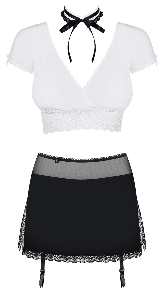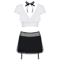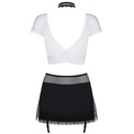 Игровой костюм секретарши в строгой гамме. Короткий облегающий топ с глубоким V-образным вырезом спереди и открытой спиной выглядит очень соблазнительно. Кружево в нижней части и кокетливые бантики на коротких тюлевых рукавах делаю модель более реалистичной. Аккуратный воротничок завязывается на шее при помощи атласных лент. Мини-юбка с разрезами по бокам также обшита кружевом и дополнена тюлевой вставкой. Съемные подвязки позволяют дополнить образ чулками. В комплекте: топ, воротничок, юбка, трусики-стринги.