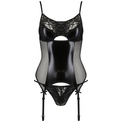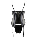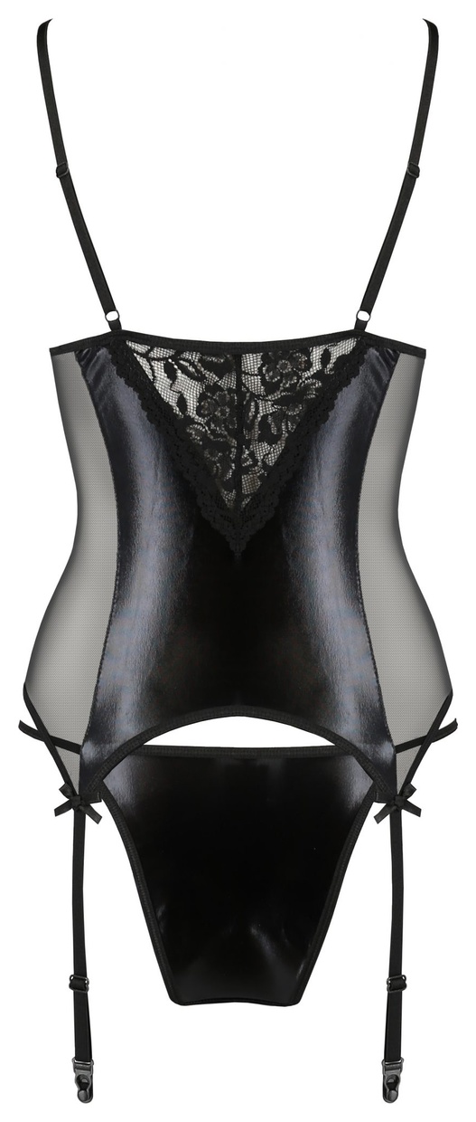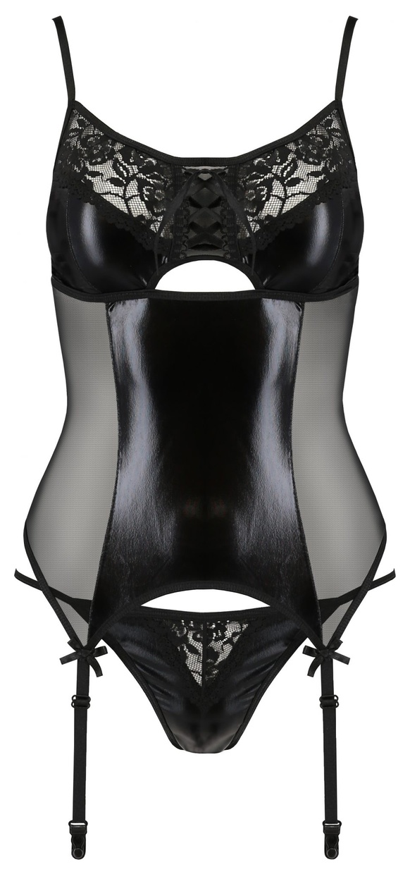 Соблазнительный корсаж Asuna с подвязками для чулок выполнен из полупрозрачного тюля в сочетании с эластичным кружевом и мерцающим материалом, имитирующим кожу. Лиф мягкий без косточек, декорирован пикантным вырезом и шнуровкой из тонкой атласной ленты. Бретели и подвязки регулируются по длине. В комплекте: корсаж, трусики.