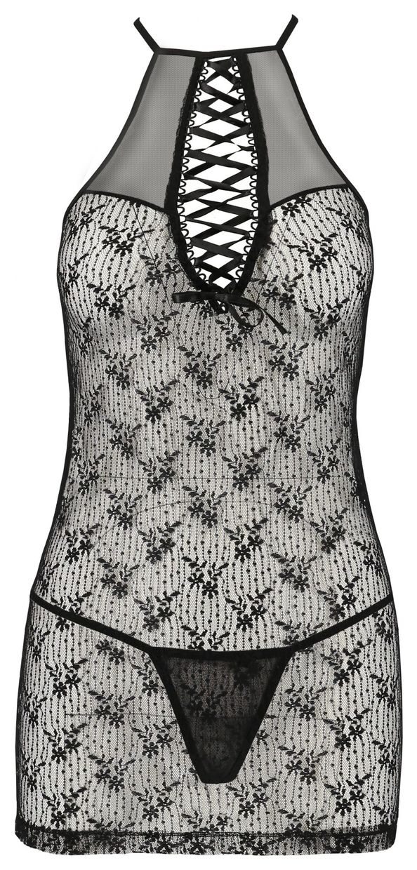 Соблазнительная сорочка Azalia выполнена из мягкой сеточки с оригинальным узором. Регулируемые бретели изящно перекрещены на спинке. На груди пикантный вырез украшен шнуровкой из тонкой атласной ленты. В комплекте: сорочка, трусики-стринги.