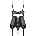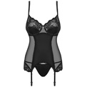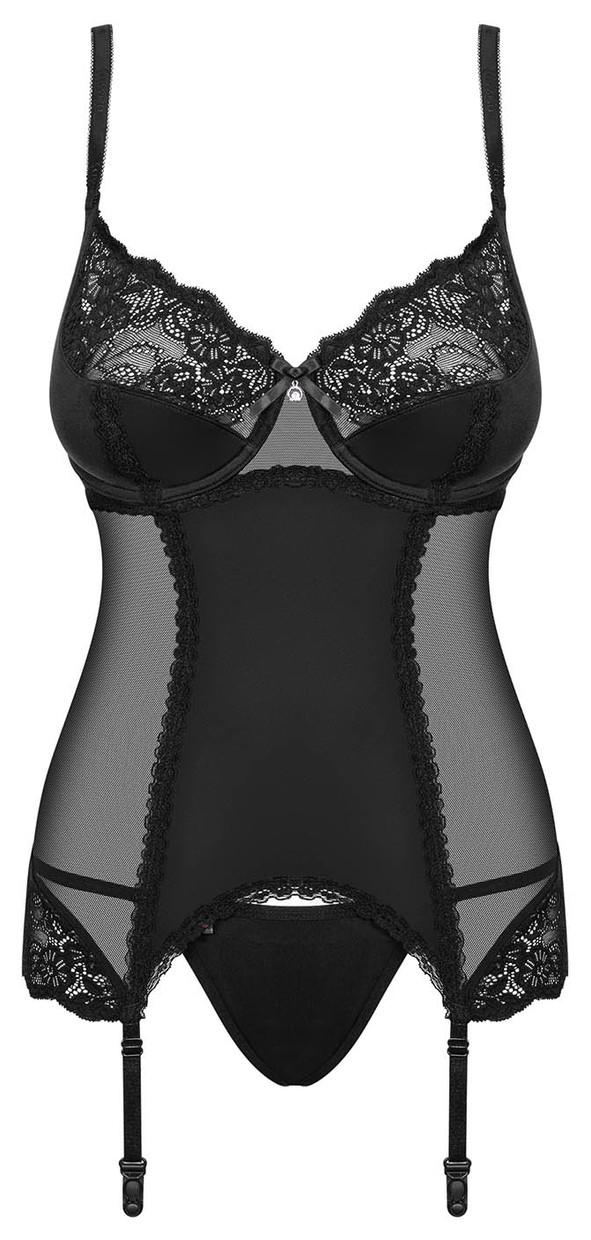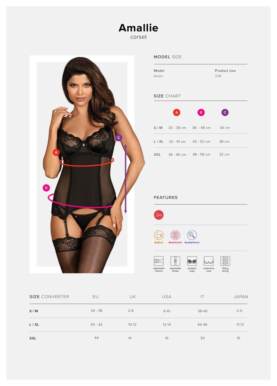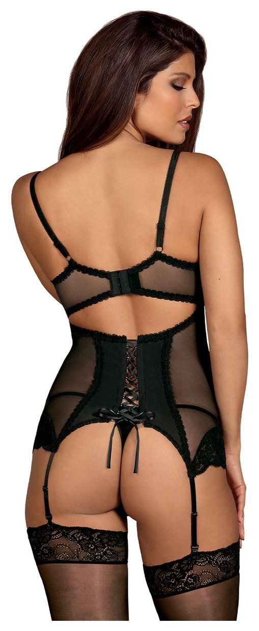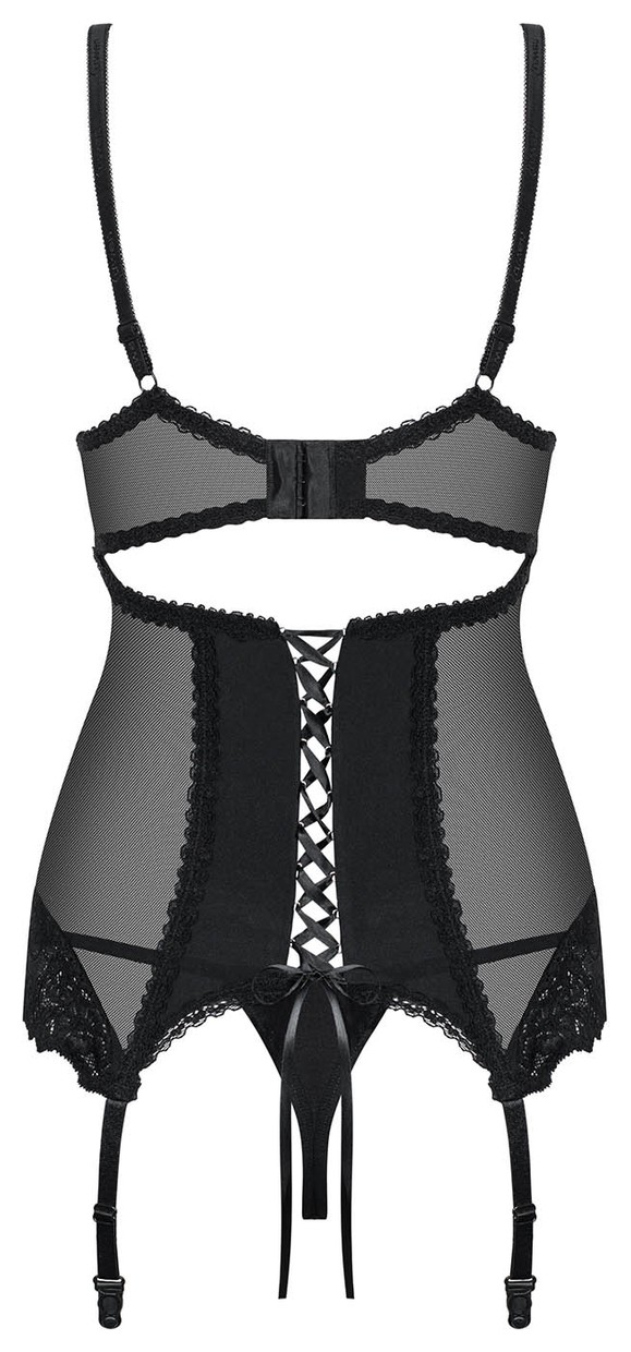 Корсаж Amallie выполнен из эластичной ткани в сочетании с полупрозрачными вставками. Комбинированные чашечки на косточках, верх выполнен из кружевного полотна, а низ на тонком поддерживающем поролоне. Бретели и пажи для чулок регулируются по длине, на спинке застежка на крючки-петли и очаровательная шнуровка. В комплекте: корсаж и трусики-стринги.