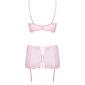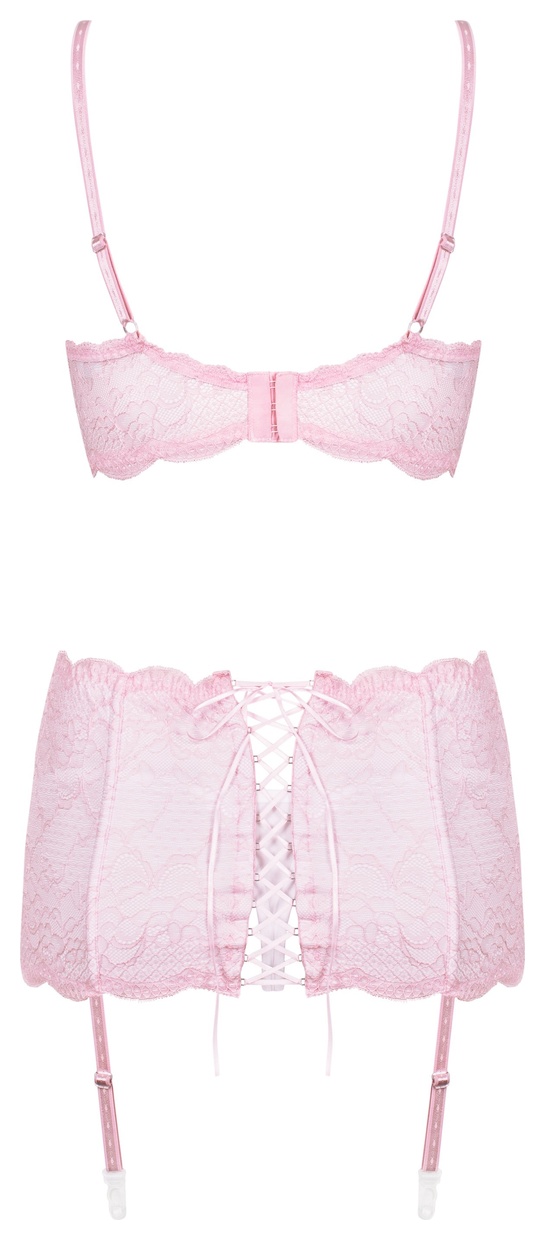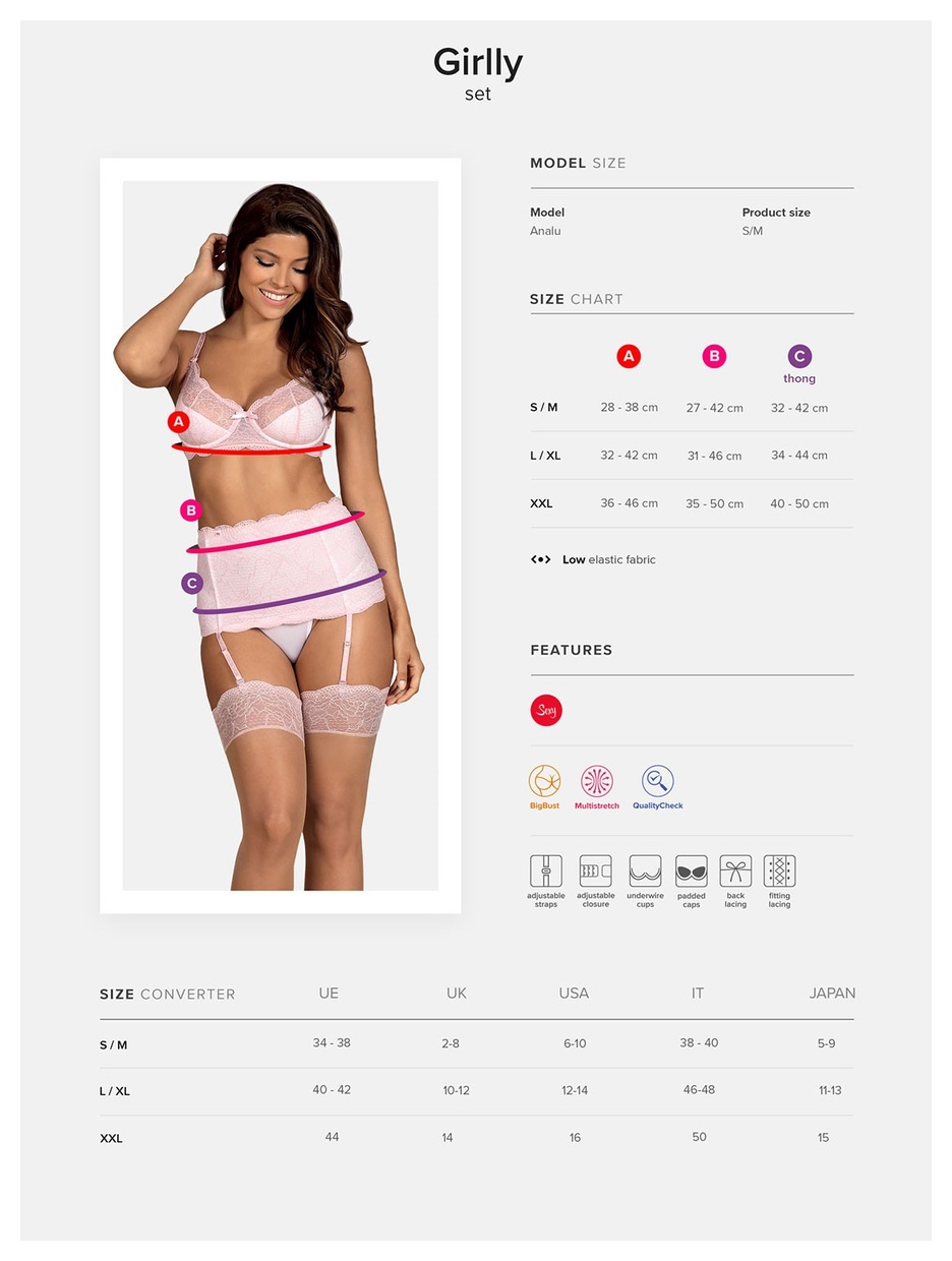 Восхитительный комплект нижнего белья Girlly состоит из бюстгальтера, пояса для чулок и стрингов. Лиф с комбинированными чашками на косточках, верх выполнен из кружевного полотна, а низ на тонком поддерживающем поролоне. Бретели и пажи для чулок регулируются по длине, на спинке застежка на крючки-петли. Пояс с очаровательной шнуровкой сзади. В комплекте: бюстгальтер, трусики-стринги, пояс для чулок.