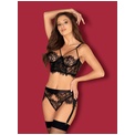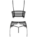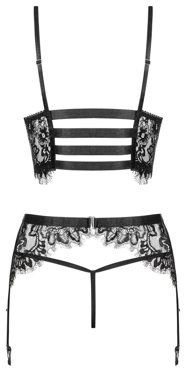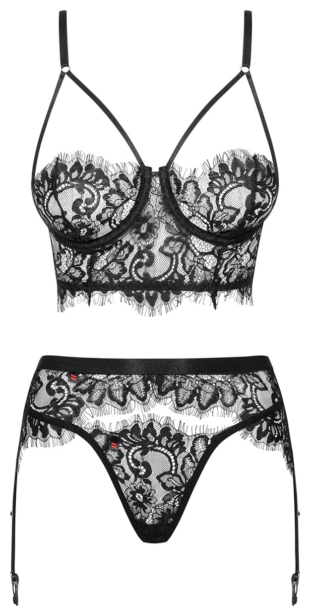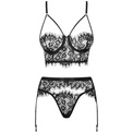 Потрясающий комплект нижнего белья Lashy выполнен из роскошного эластичного кружева. Комплект состоит из бюстгальтера-топа, пояса для чулок и стрингов. Бюстгальтер с мягкими чашками на косточках, декорирован эластичными стреп-лентами. Бретели и пажи для чулок регулируются по длине. Пояс с удобной застежкой сзади. В комплекте: бюстгальтер-топ, трусики-стринги, пояс для чулок.