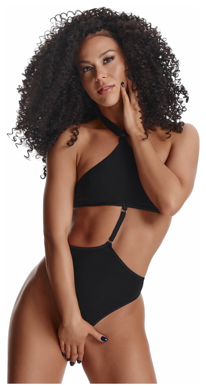 Тедди из приятного на ощупь и гибкого материала черного цвета с доступом. На спине высокий профиль подчеркивает ягодицы. Спереди верх и низ туловища соединены резинкой с серебряным регулятором.