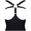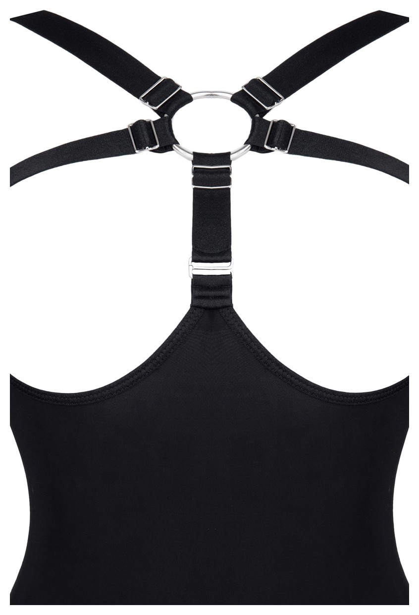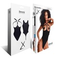 Тедди из приятного на ощупь и гибкого материала черного цвета. Спереди эффектная композиция из черных резиновых лент в сочетании с серебристой металлической заклепкой и декоративными регуляторами. Приятные на ощупь каучуки с металлическим блеском. Высокопрофильный крой на бедрах сексуально подчеркивает ягодицы и бедра. Благодаря многочисленным регуляторам комплект можно идеально адаптировать к телу.