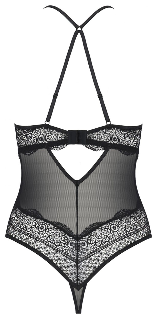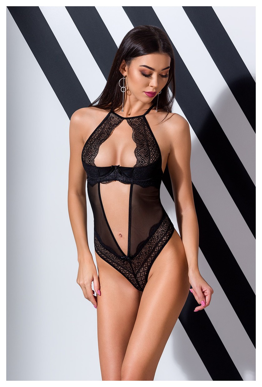 Соблазнительное боди Yona выполнено из мягкой сеточки и эластичного кружева. Полуоткрытые чашки на косточках усилены поролоном для лучшей посадки груди. Регулируемые бретели изящно перекрещены на спинке.
