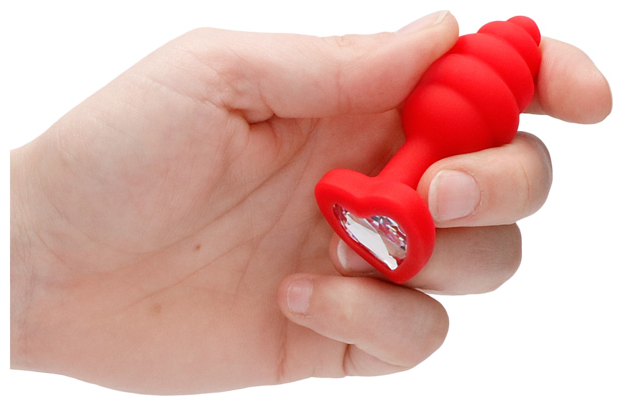 Красная анальная пробка Regular Ribbed Diamond Heart Plug - 7 см